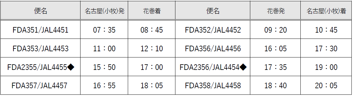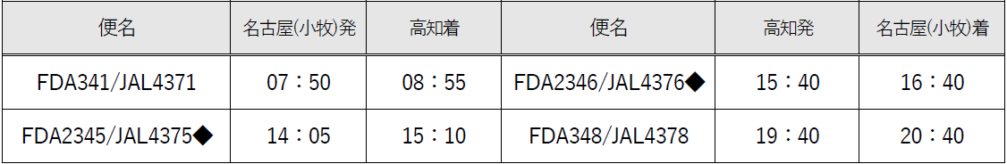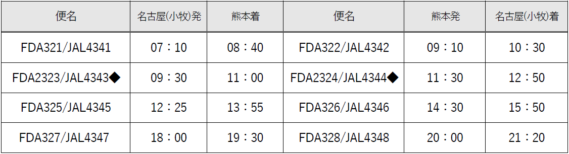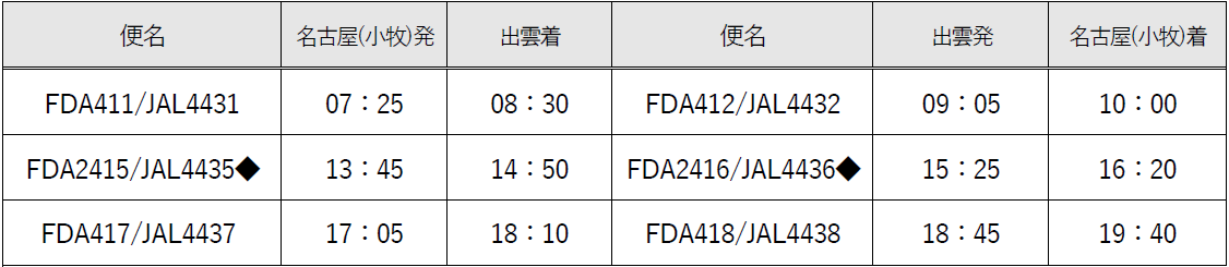 ※なお、JALとのコードシェアは実施いたしませんが、FDAでは以下の便も期間増便いたします。