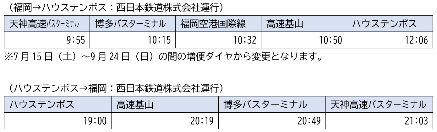 ハウステンボス~福岡系統は①②の期間+1往復(通常ダイヤと合わせ合計3往復運行)