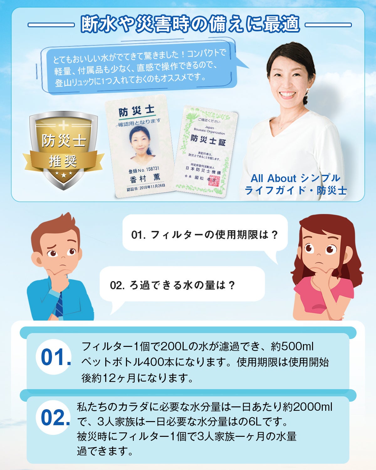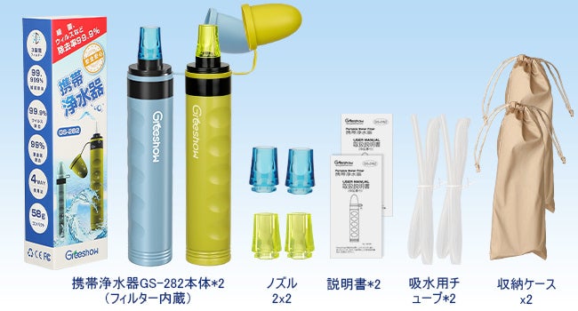 Greeshowの携帯浄水器は、災害や断水などの緊急時、地震、津波、台風、豪雨などの自然災害が発生した時、川やため池の水、お風呂の残り水などを安心して飲めるほど透き通った清潔な飲料水にろ過することができます。大切な家族の為の災害時の備え! 緊急用に一つ常備しておくことをおすすめします。