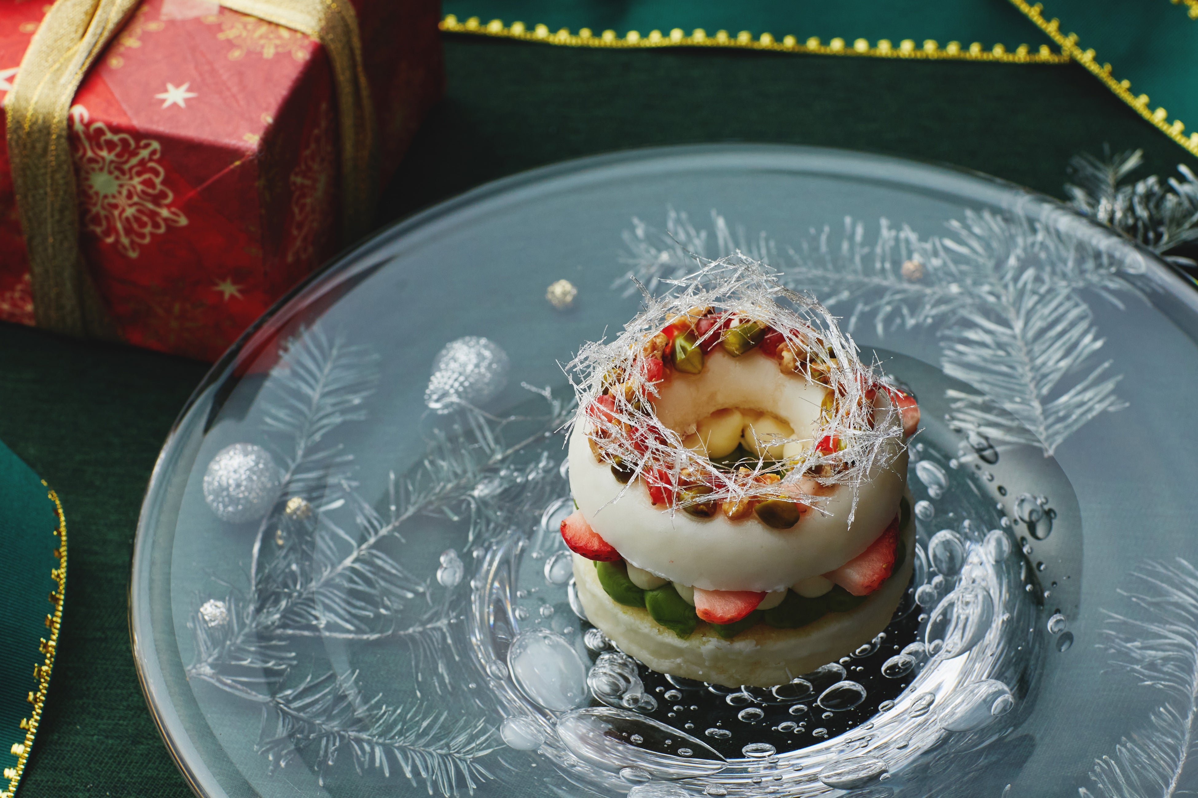 霧氷テラスにある雲Cafeにて、Cloud Pool(クラウドプール)のクリスマスリースをイメージしたドーナツを提供します。ピスタチオや苺をリース状に飾り付け、仕上げに飴細工で霧氷を表現しました。一緒にサンドしているクリームは、ファーム星野(*)の生クリームを使用したクリームチーズと、ピスタチオクリームです。ドーナツの上部のナッツ類はレモン風味のアイシングでコーティングしているため、クリームの濃厚な味わいを感じつつ、さっぱりと食べれます。