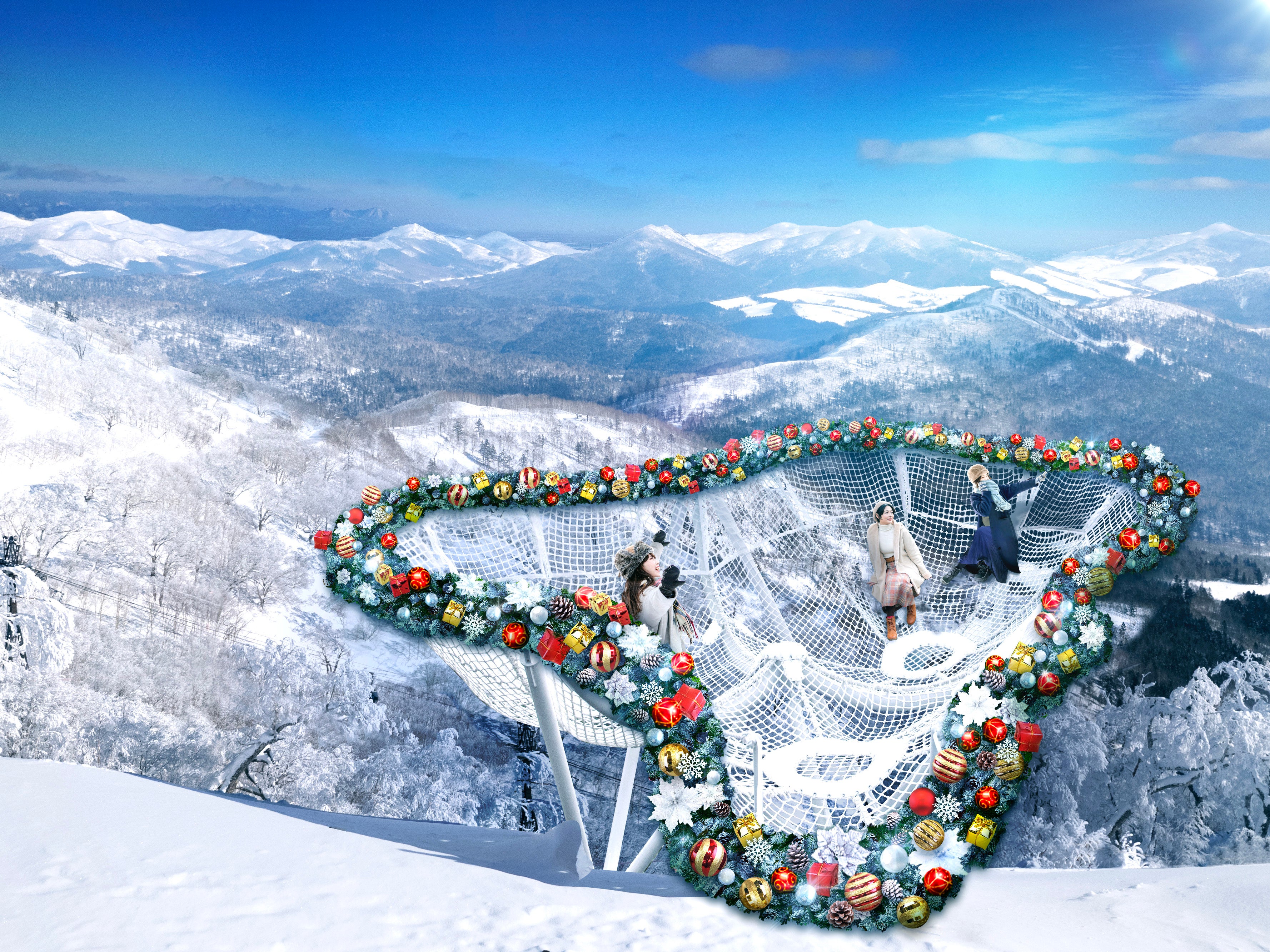 展望スポットの一つであるCloud Pool(クラウドプール)をクリスマスリースに見立てて装飾をします。これは、空中にせり出している縦横10mのハンモックのような展望スポットです。霧氷の絶景が広がる中、クリスマスリースの中に入っているような写真が撮れます。