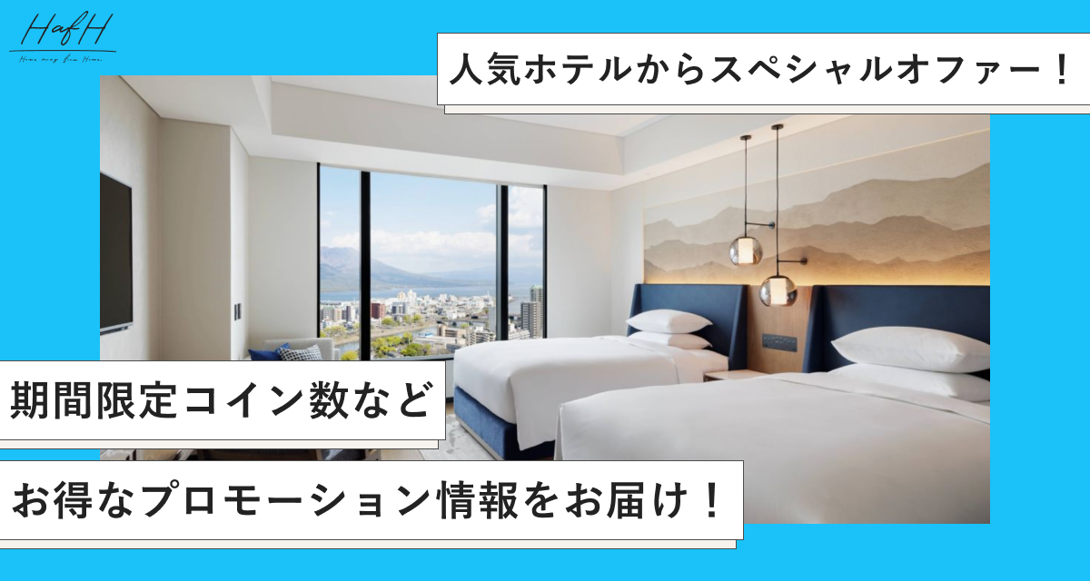本日9月25日(月)より、下記のホテルにてHafH限定スペシャルオファーの予約を開始します。レイトチェックアウト無料や期間限定でお得なコイン数でご宿泊いただけるなど、様々な特典を提供します。