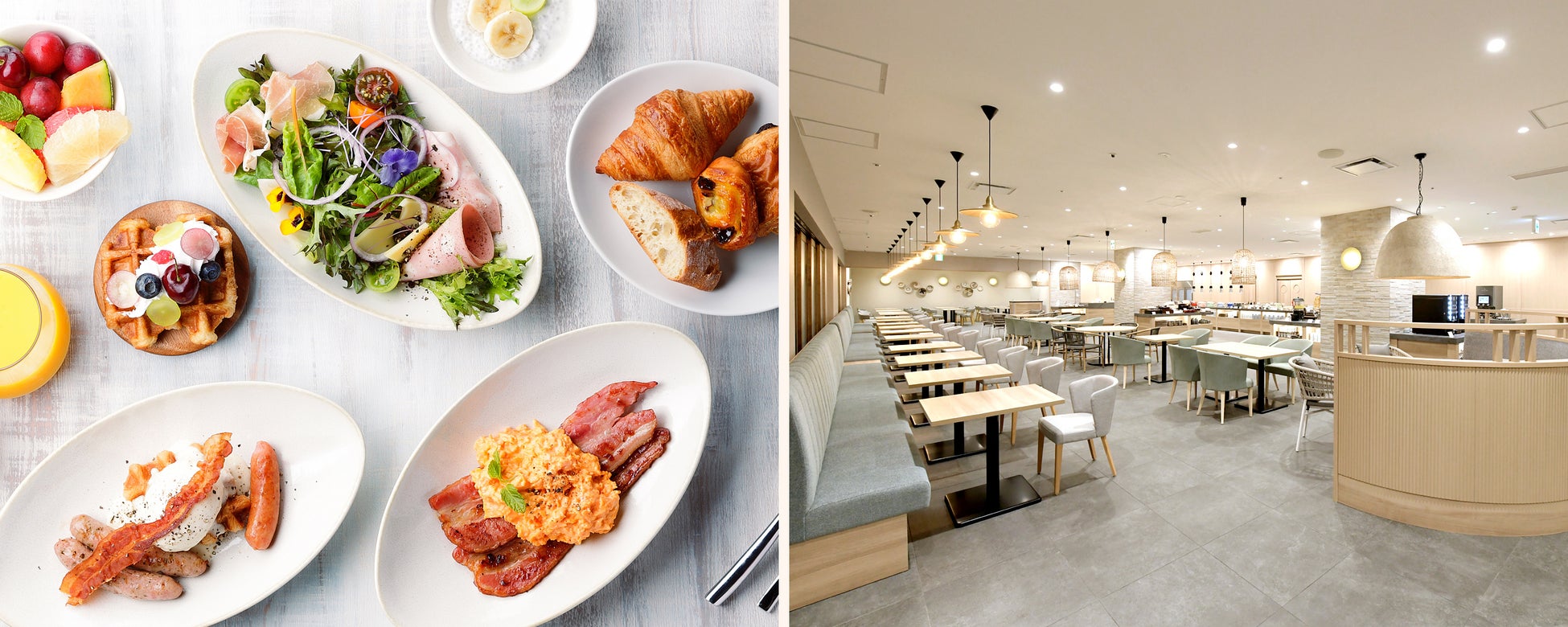 濃厚チーズソースで楽しむ「クロッフル ベネディクト」や、シェフが目の前で仕上げる「肉厚ビーフバーガー」、オレンジを丸ごと搾って作るフレッシュオレンジジュースをはじめ、地元食材を使った博多のご当地グルメなど、心躍る朝食が楽しめます。
