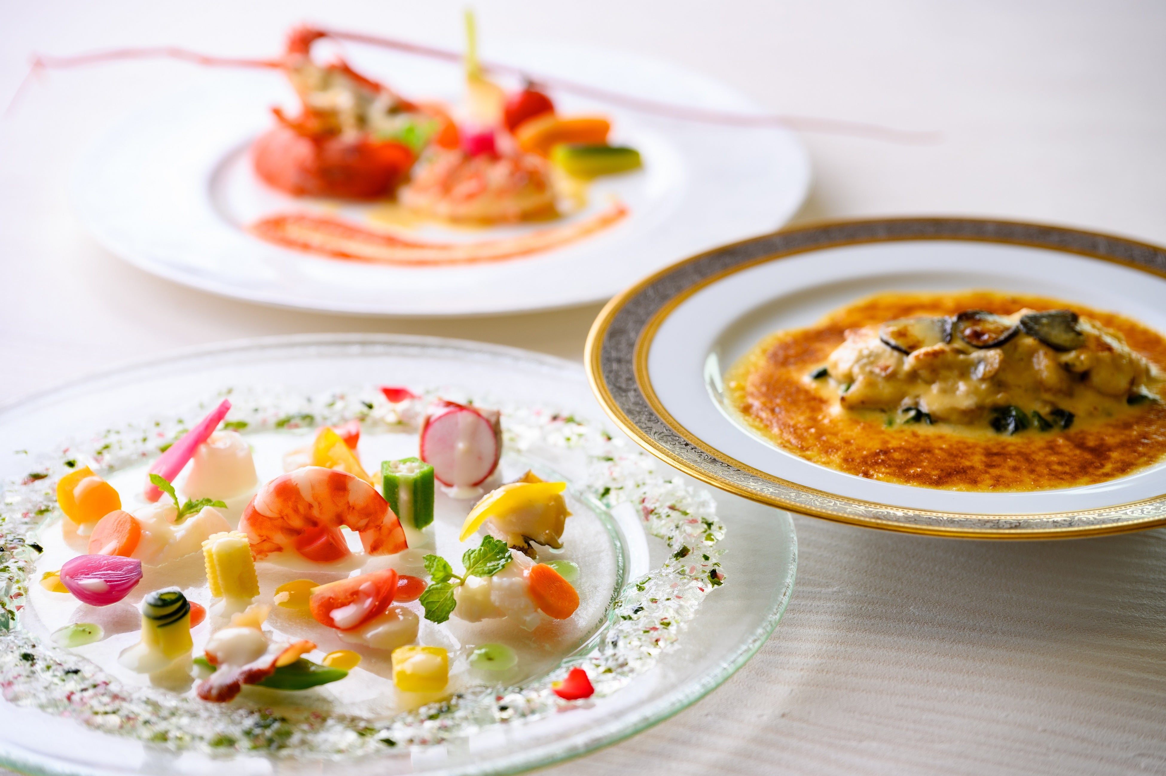 ウツボを使った「海の幸と彩り野菜のパレット仕立て」、「ウツボのボンファン トリュフ添え」を入れたコース料理。軽く霜降りをしたウツボを、さまざまな海の幸や彩り野菜とともに召し上がっていただけます。