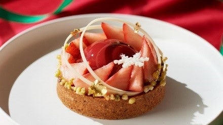 フランス伝統菓子パリブレストをクリスマスリースにオマージュして作りました。濃厚でほんのり甘いピスタチオを中心に、シューの中にはタイベリーのコンフィチュールを合わせ、グリーンとレッドのクリスマスカラーに心躍るスイーツです。ピスタチオのシャンティ、クリスタリゼとプラリネなど、異なるピスタチオの食感と舌ざわりをひとつに詰め、ナッティーなピスタチオ独特のおいしさに目がないピスタチオラバーにお勧めです。