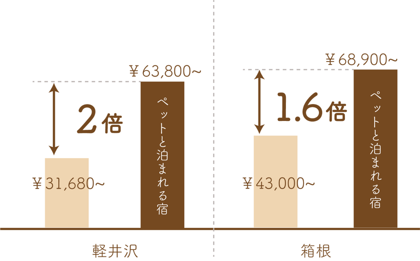 このような背景から、稼働率の低い宿をペットと泊まれる宿泊施設にすることで、集客力を高めることに加え、客単価を上げて稼働率の低さをカバーできると考えました。また、軽井沢エリアや箱根エリアの宿で比較した場合、ペットと泊まれる宿は前述の通り需要が高く、宿泊料金が高くても集客が見込めるため他施設との差別化を図ることができます。(下図参照)