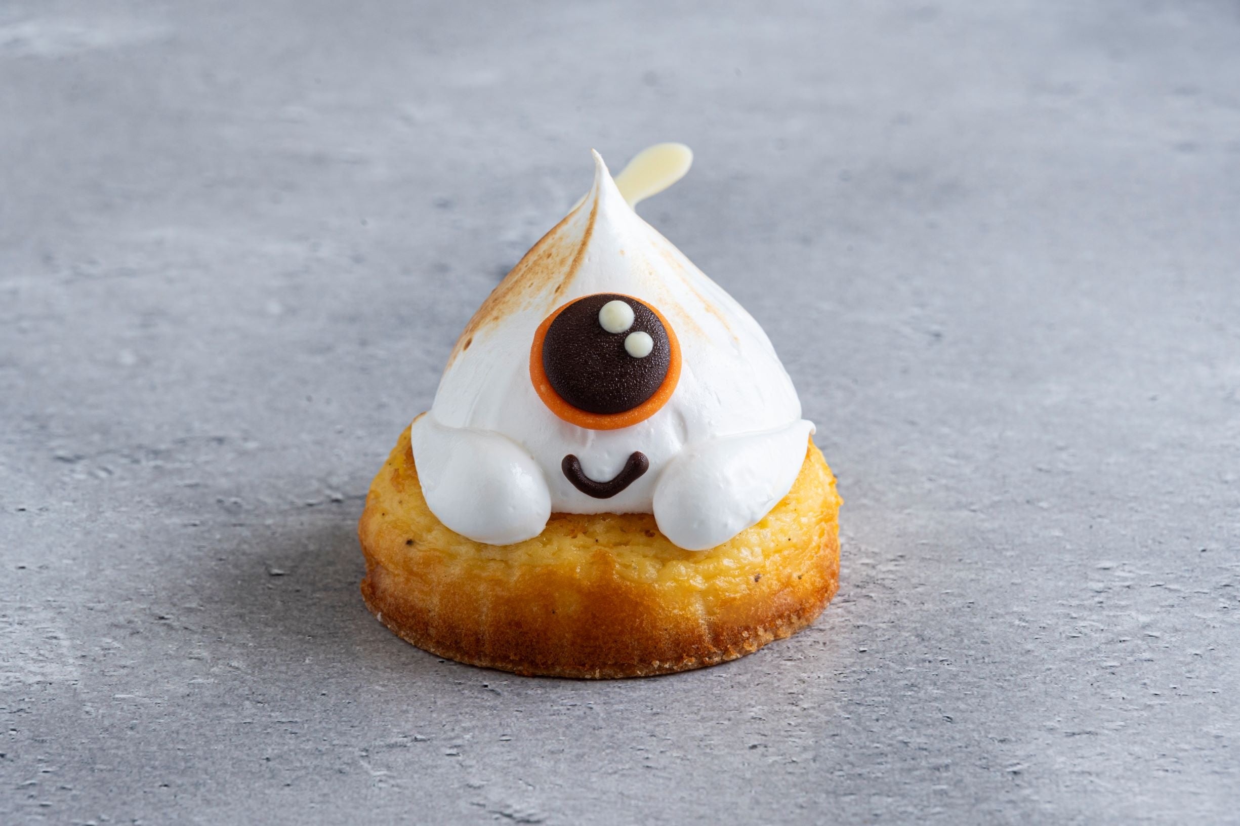 マカロンなどに使われるイタリアンメレンゲの中に、レアチーズと果肉入りのフランボワーズソースを仕込んだ、さっぱりとした味わいのチーズケーキを可愛らしいモンスターに見立てました。全体的に軽い口当たりで食べやすく仕上げました。
