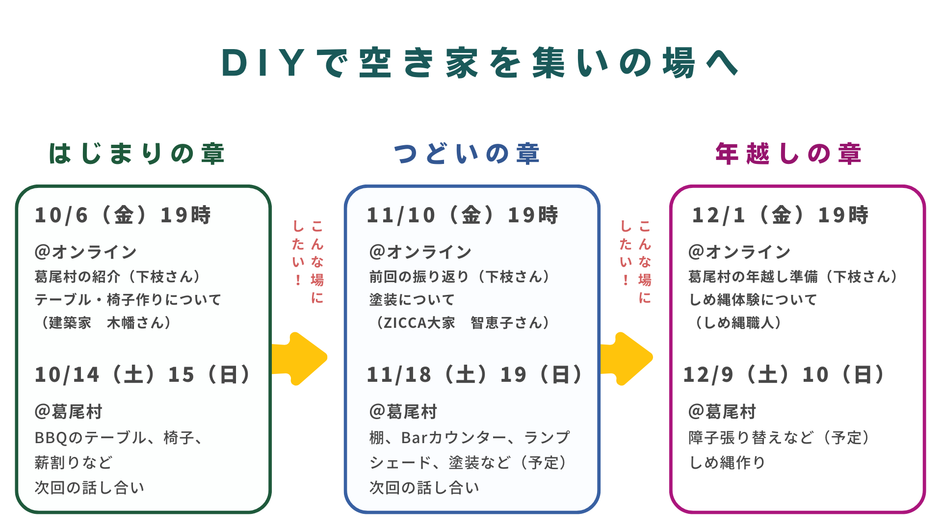 第一回のオンラインイベントでは、葛力創造舎の下枝氏より葛尾村の地域課題や空き家の現状についてを講義した後、双葉郡出身で郡山市を拠点に設計事務所を営む、一級建築士の木幡智和氏よりDIYの基礎知識についてお話しします。現地でのDIY体験では、同施設で使用する椅子やテーブルを制作しながら、地域の方との交流会や郷土料理を楽しめる昼食を用意し、地域との関係を深めていきます。
