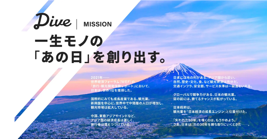 ダイブは、日本経済の成長エンジン「観光」の大課題を解決すべく、事業展開しているベンチャー企業です。