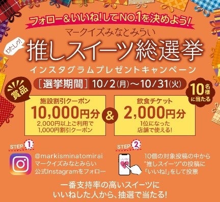 MARK IS みなとみらいでは、アニバーサリーイヤーの秋に、ご自身のお気に入りのスイーツを探して、投票ができるInstagramプレゼントキャンペーン「わたしの!推しスイーツ総選挙」を開催いたします。MARK IS みなとみらいの公式アカウントをフォローして、10個のスイーツ投稿に、「いいね!」をすることで投票していただけます。一番支持率の高いスイーツの投稿に「いいね!」をしているフォロワーの中から、抽選で素敵な賞品をプレゼントするキャンペーンです。