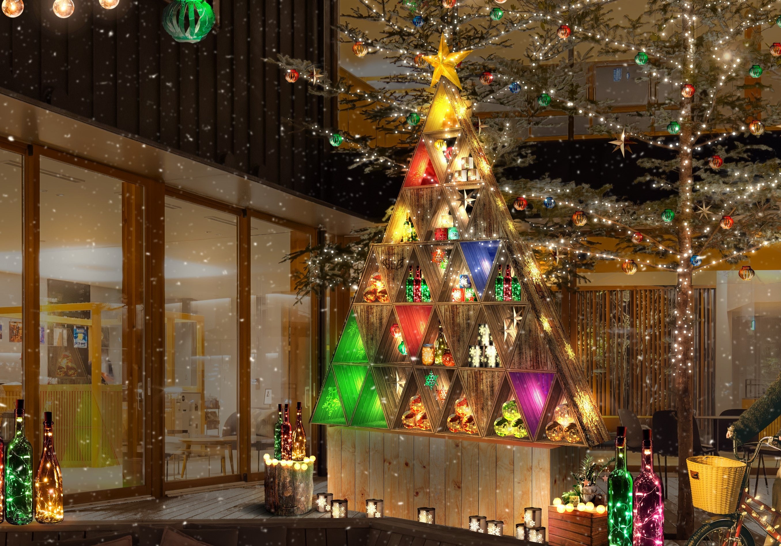 台風や積雪などでの倒木を防ぐために、定期的に手入れとして伐採されている間伐材を土台として、アップサイクル(*)したクリスマスツリーをオリジナルで作成しました。今年は、昨年よりも約1m高くなりTAMARIBA(タマリバ)の中庭に登場します。装飾にはホテル運営で生じた瓶や、缶などを合計約100本以上再利用し、色鮮やかに素敵にクリスマスツリーを彩ります。