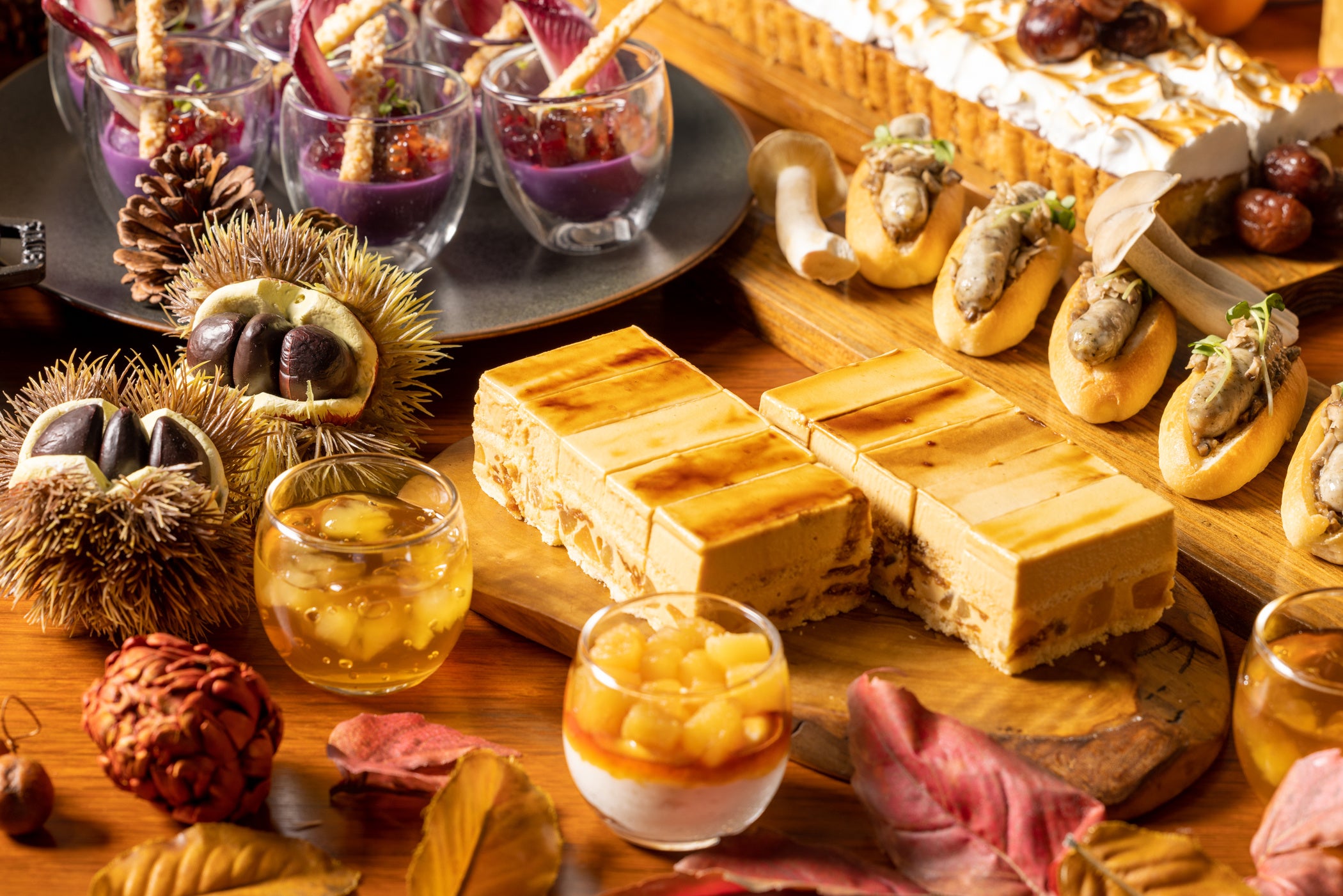 「オータム アフタヌーンティー ブッフェ」では、秋に旬を迎える芋や栗、かぼちゃでつくるこの季節ならではのスイーツ6種類とセイボリー5品をブッフェスタイルでご用意いたします。かぼちゃを練り込んだしっとり柔らかいスポンジに、かぼちゃクリームと刻んだかぼちゃを入れた“かぼちゃづくし”のパンプキンロールや、刻んだ栗とコクのあるアーモンドクリームを練り込んだタルト生地に、口当たりの良いイタリアンメレンゲをトッピングしたマロンタルト、まるごとの栗をたっぷりとトッピングした程よい甘さの生クリームをシュー生地でサンドしたマロンパリブレスト、洋梨のコンポートとキャラメルムースが濃厚な味わいの洋梨とカスタードのムースケーキなど、この時期にしか叶わないさまざまなスイーツが並びます。セイボリーには、さつまいもとチーズをサクサクの生地で包んださつまいもとチーズのパイをはじめ、グラスに入れたほんのり甘い紫芋のピューレにノンアルコールの赤ワインゼリーやビーツ、いくらをトッピングした紫芋ピューレ 赤ワインゼリーとビーツのベリーヌ いくら、鱈のクロケット、キノコとハーブソーセージのホットドッグなどが登場します。