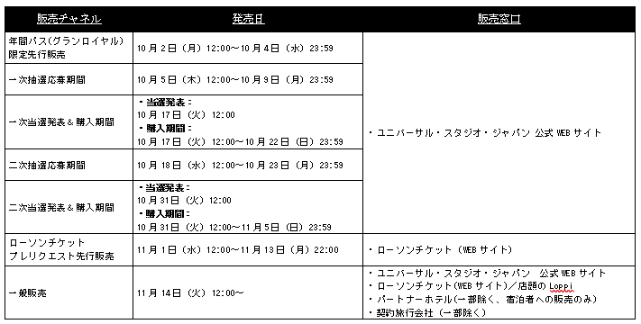 「パーティ・パス」(¥14,900円~/税込)は、下記のとおり、各所で抽選販売、先行販売を実施し、11月14日(火)より一般販売となります。詳しくはユニバーサル・スタジオ・ジャパン公式WEBサイトをご確認ください。
