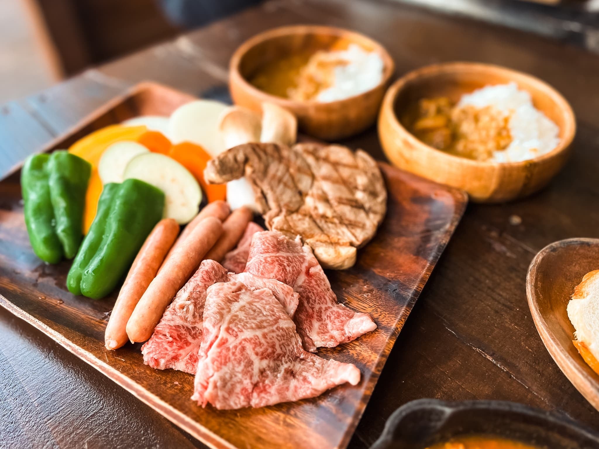 夜は特選黒毛和牛や季節の野菜を中心としたここでしか味わえないこだわりのグランピングメニューをご用意しております。