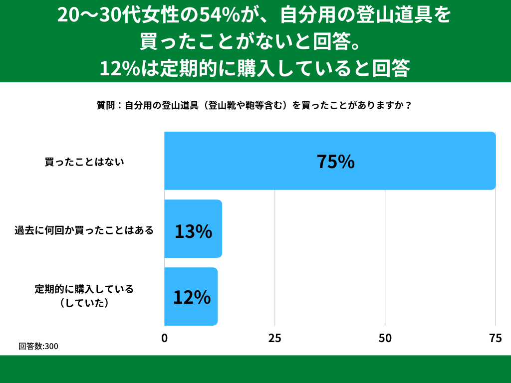 20~30代女性の75%が、自分用の登山道具を買ったことがないと回答。12%は定期的に購入している(していた)と回答【登山道具に関するアンケート】