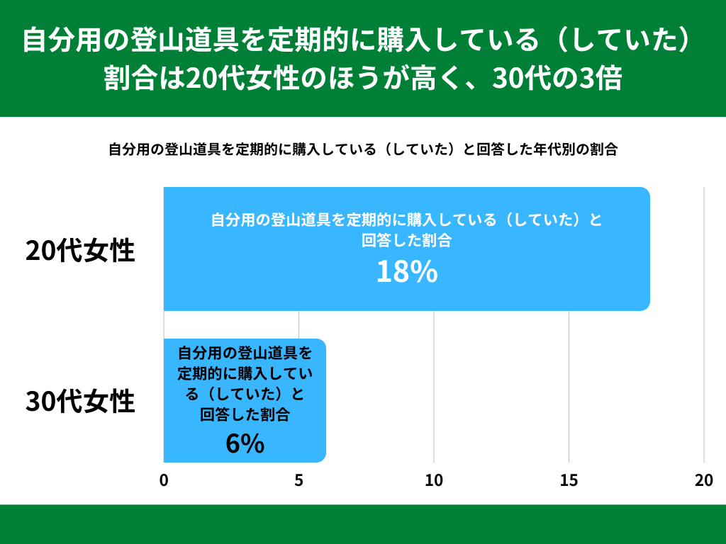 【自分用の登山道具を定期的に購入している(していた)割合は20代女性のほうが高く、30代の3倍】