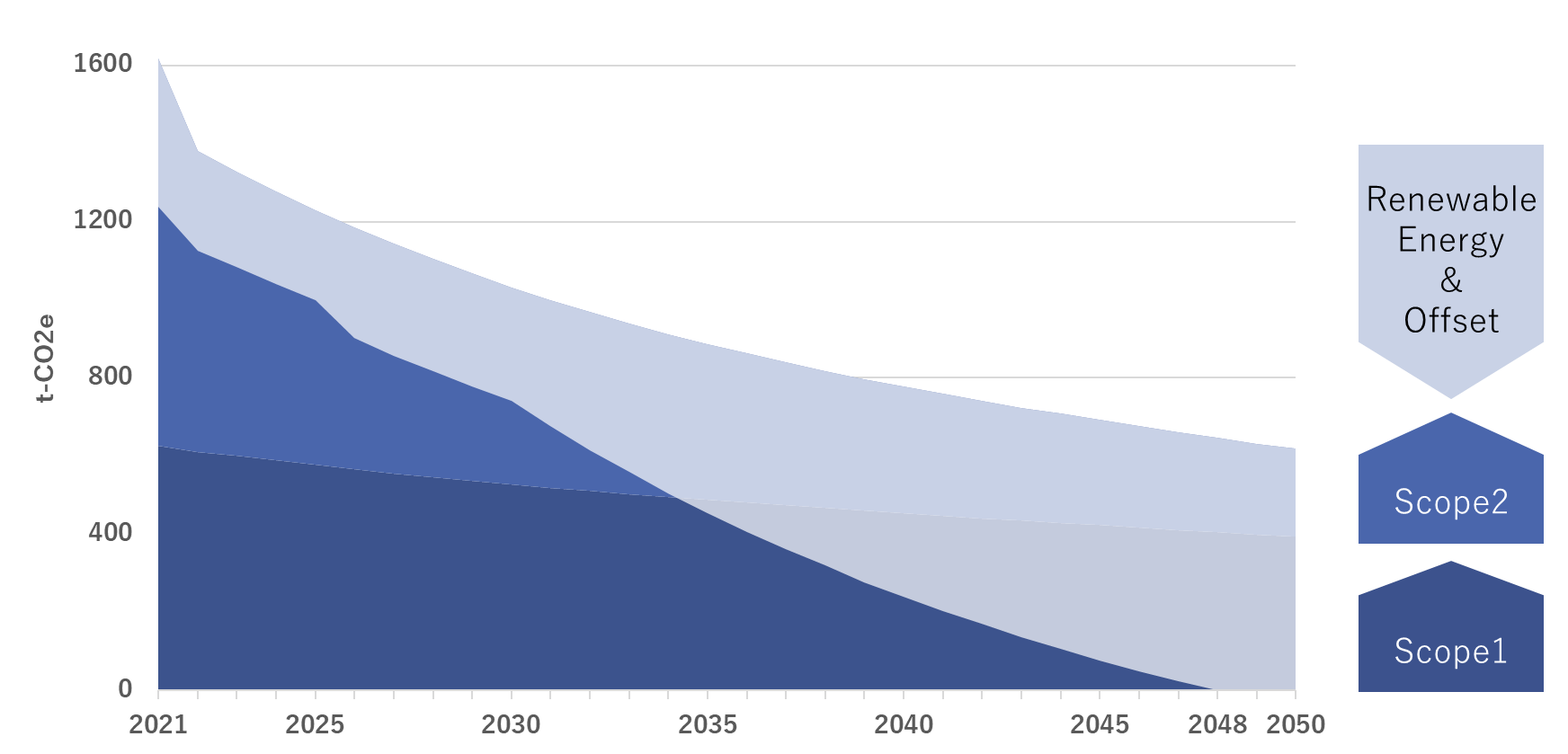 2021年および2022年のCO2e排出実績より、エネルギー使用量の年間削減ペースをScope1は2.5%、Scope2は6.1%に設定し、2050年までこの削減ペースを堅持します。再生可能エネルギーの活用による排出係数の低減、Jクレジットを活用したカーボンオフセットによるCO2e排出量の相殺等を加味し、2048年にSAGA COLLECTIVE全体でカーボンニュートラルを達成する計画です。