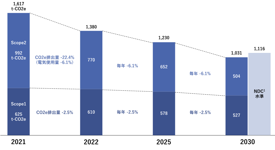 2021年度から11社が一丸となりカーボンニュートラルに取り組み、重油やガソリン等による直接排出(Scope1)を2.5%、電力による間接排出(Scope2)を22.4%、全体で約15%のCO2eを削減しました。照明のLED化や社用車のEV化、電力消費モニタリングシステムの導入等によりエネルギー使用量を削減した成果です。引き続き、重油ボイラーの運用改善等に取組み、2030年度はエネルギー使用量の削減効果のみで、NDC[1]水準(2013年度比46%削減)を達成する計画です。