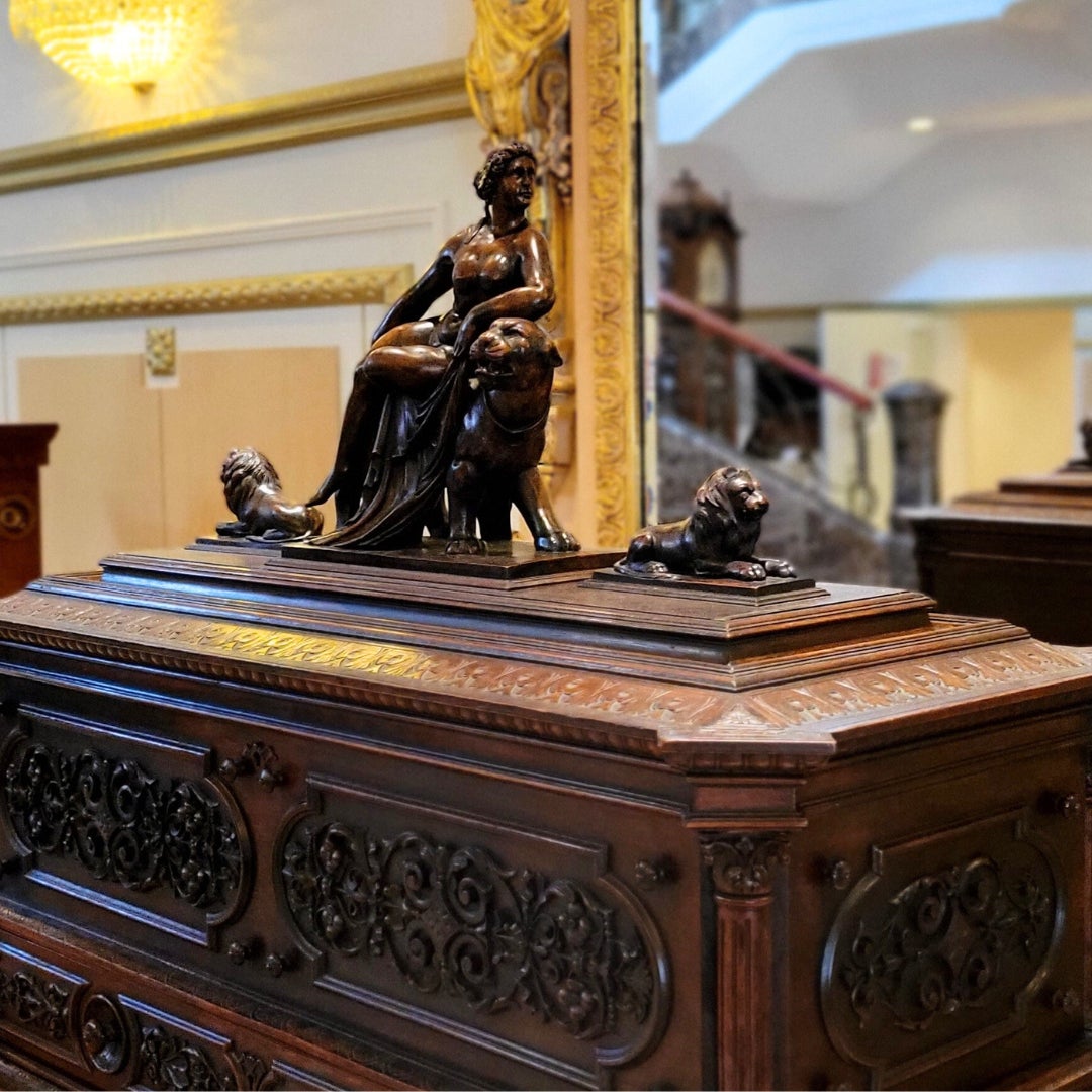 スイスが世界コロンビア博覧会(シカゴ万博1893)に出展した作品です。ケースは高級木材であるマホガニー材が使用され美しい光沢を放っています。蓋上部にはスイスの女神ヘルヴェティアが彫刻されており、硬い木材から生み出された身体のしなやかで優美な曲線や凛々しい眼差しをもつ繊細な顔の造形をお楽しみください。