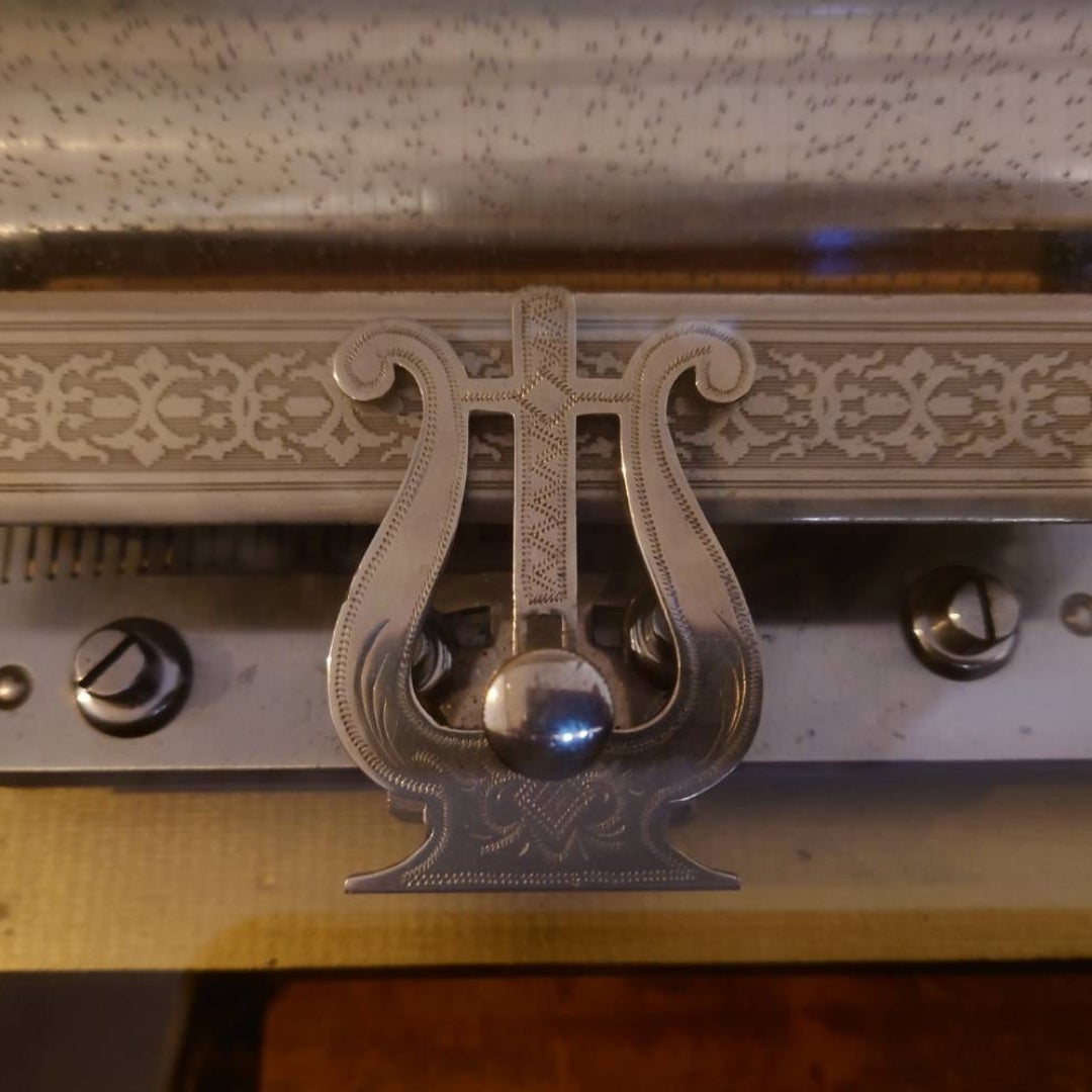 オルゴールの音色を変えるチターアタッチメントにも、高級機種ならではの職人の技をみることができます。中央には竪琴の装飾を見ることができ、その形の中にも細やかな彫金が施されています。またアタッチメントの板には直線を並べ、葉や花を思わせる図柄を浮き出されており、パーツひとつひとつに職人の美学が感じられます。