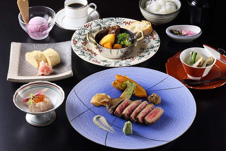 ランチ限定のおトクなコース。鉄板の上でくるくると卵を巻く技が楽しめる「鉄板で仕上げるだし巻き玉子」や、クリアでほっとする味わいの「鶏と蕪のスープ」でスタート。メインの「近江牛ビーフシチュー バケット添え」はとろとろに煮込まれた近江牛のこっくりと深い味わいが楽しめます。さらに、目の前で焼き上げられた牛フィレ肉の鉄板焼で、充実の食べ応え。