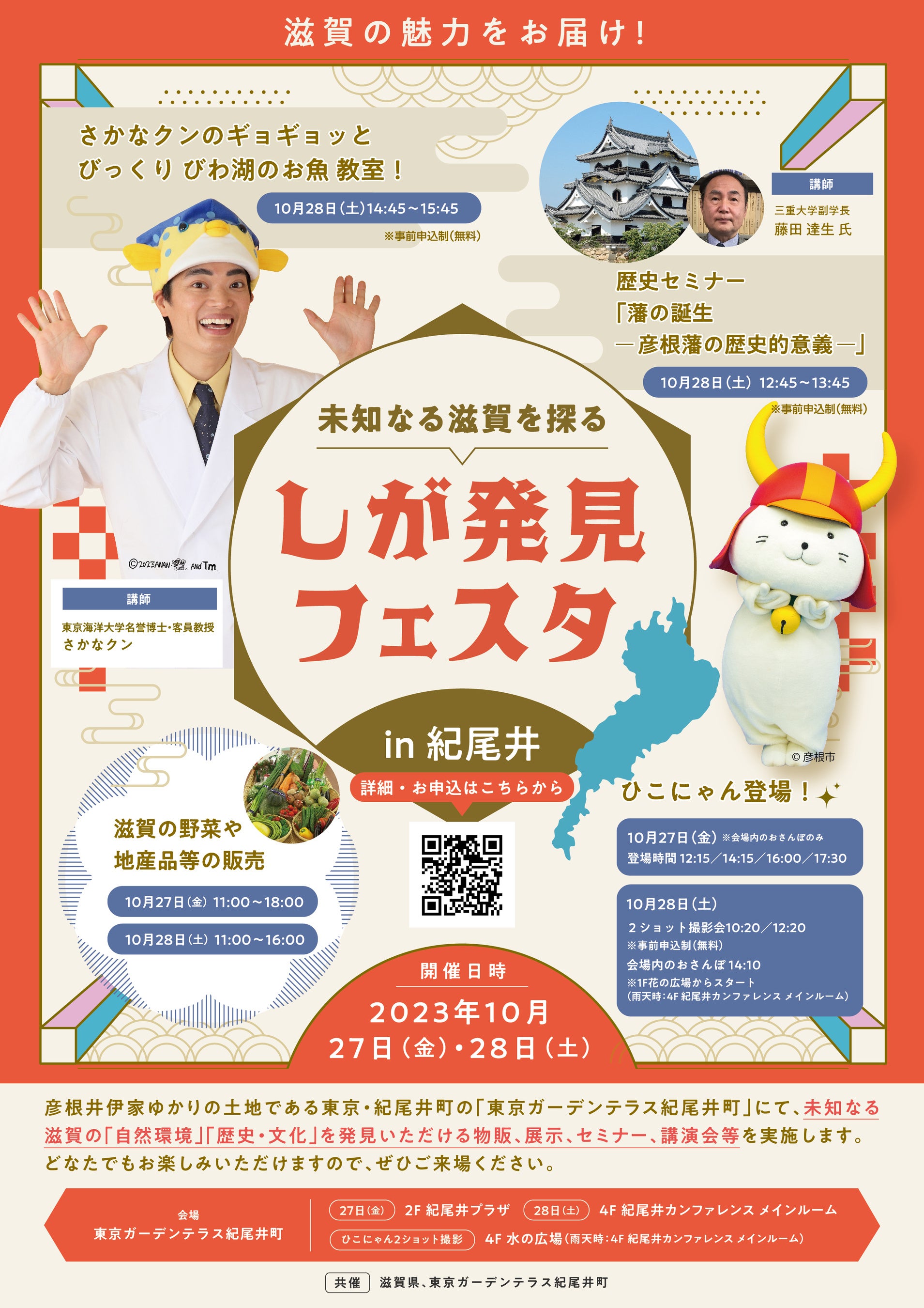 なお、歴史セミナー、さかなクン講演会、ひこにゃんとのツーショット撮影会への参加は、事前申込みが必要となります。