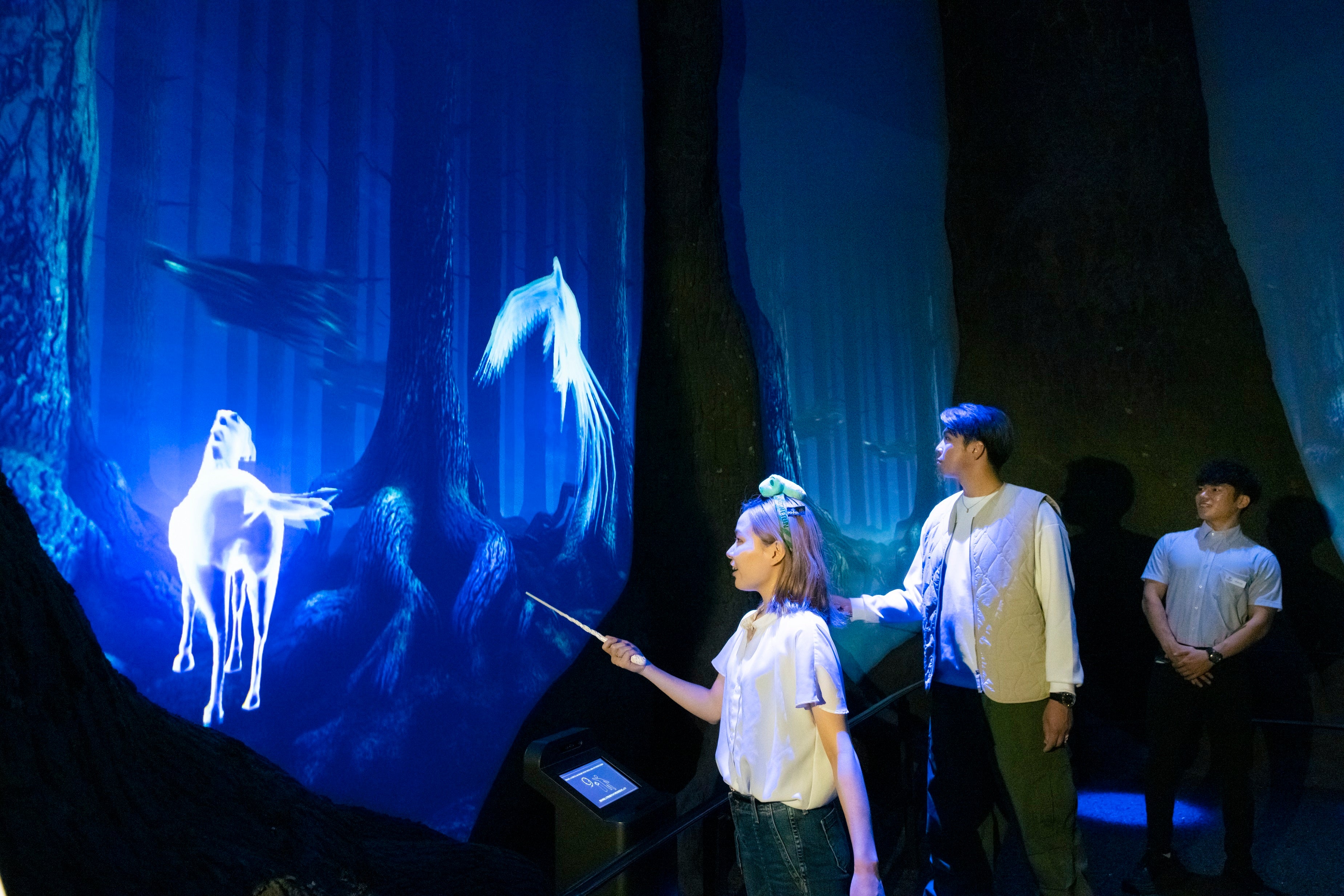 禁じられた森は、2つのエリアを探索することができます。 温かいハグリッドの小屋にたどり着けるかもしれませんし、足を進めるたびに暗さを増す森の中心部に迷い込んでしまうかもしれません。どちらの道を選んだとしても、ヒッポグリフのバックビークをはじめとするフレンドリーな魔法動物に出会えるでしょう。しかし闇の世界に挑戦すれば、木々を飛び回る吸魂鬼(ディメンター)や闇に潜むアクロマンチュラなど、魔法ワールドの恐ろしい生き物と対峙することになります。禁じられた森を訪れると、吸魂鬼(ディメンター)を撃退する“エクスペクト・パトローナム”の呪文を唱え、杖さばきを練習するインタラクティブな体験ができます。