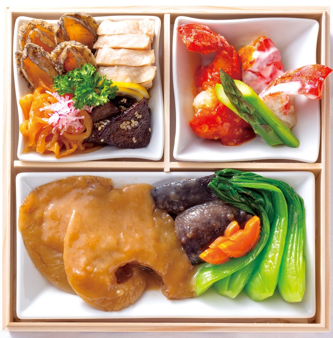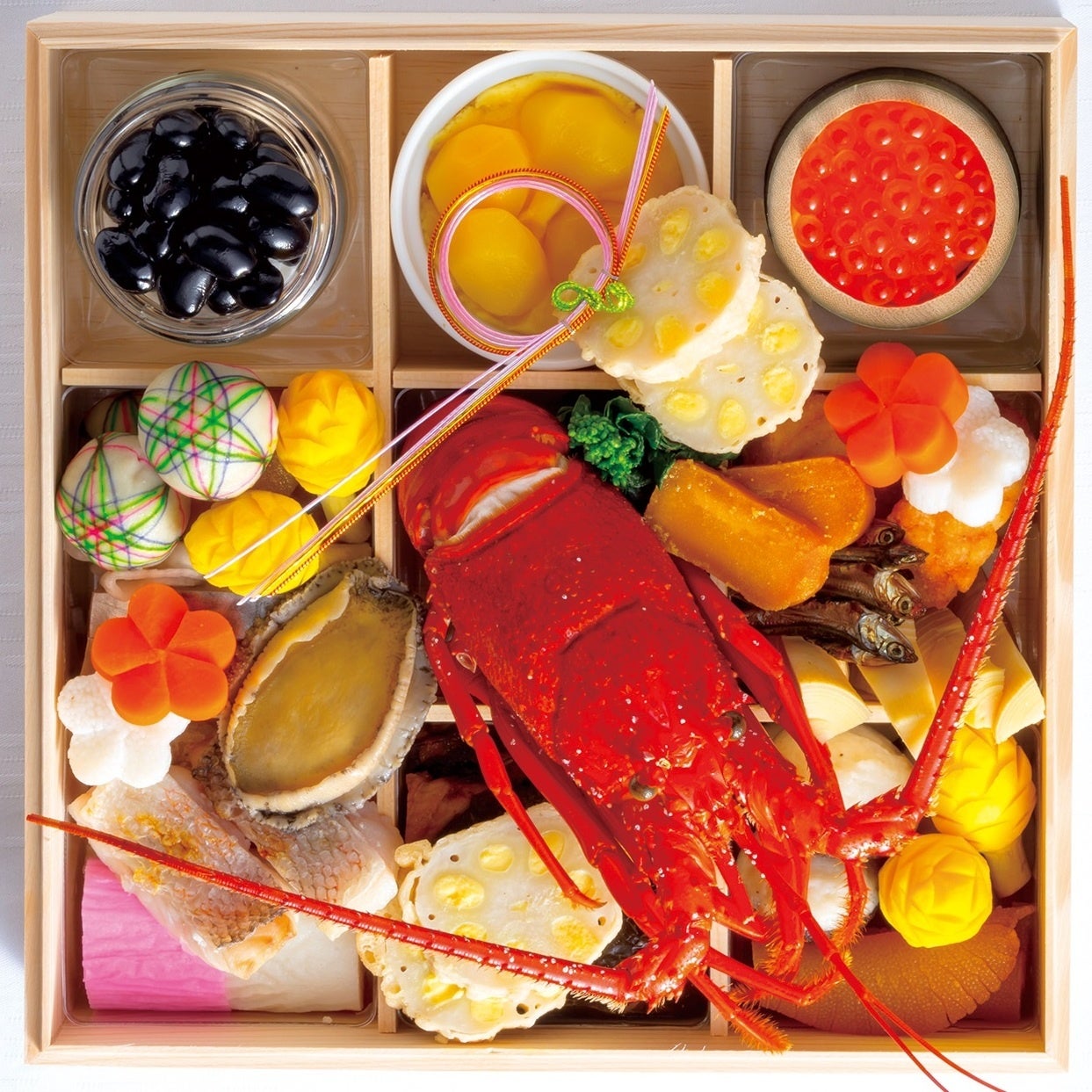 【日本料理】 伊勢海老/あわび旨煮/数の子醤油漬け/菜の花/栗きんとん/いくら醤油漬け/黒豆/甘鯛西京焼き/和牛山椒焼き/鮎昆布巻き/竹の子煮/からすみ/梅人参/梅長芋/うなぎ八幡巻き/さごし生寿司/千枚蕪/田作り/辛子蓮根/裏白椎茸/河豚竜田揚げ/網笠柚子/紅白蒲鉾/手毬麩/くわい含め煮