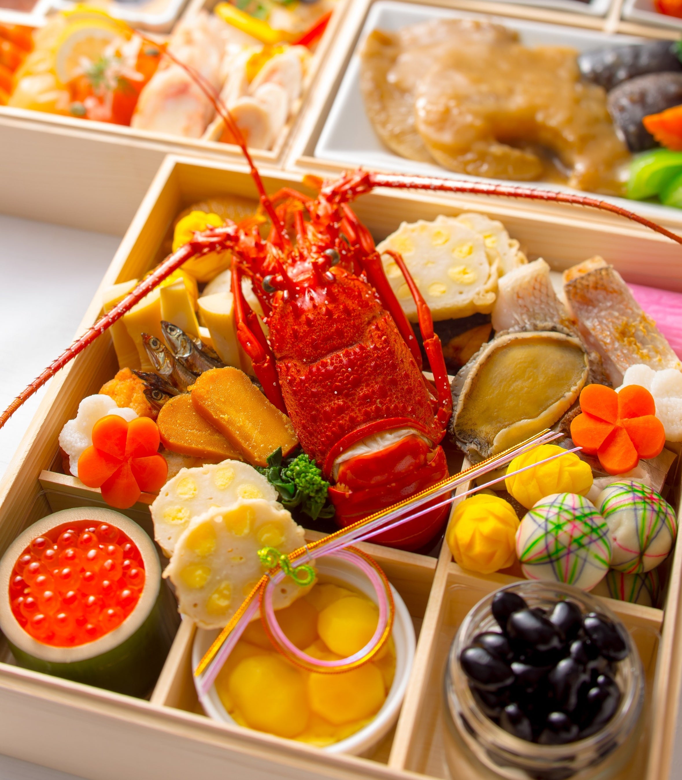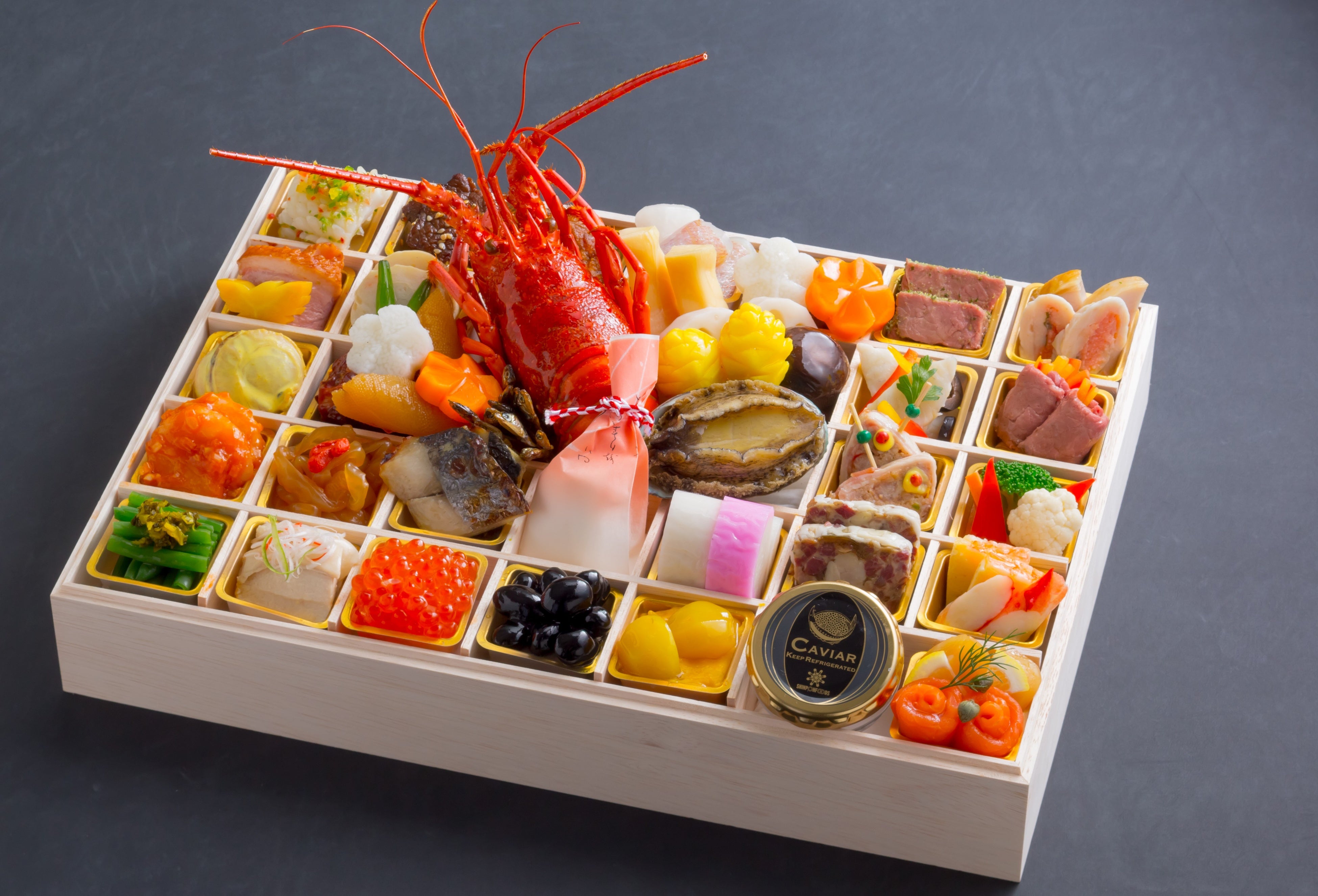 【日本料理】 伊勢海老/あわび旨煮/数の子醤油漬け/菜の花/栗きんとん/いくら醤油漬け/黒豆/甘鯛西京焼き/和牛山椒焼き/鮎昆布巻き/竹の子煮/からすみ/梅人参/梅長芋/うなぎ八幡巻き/さごし生寿司/千枚蕪/田作り/辛子蓮根/裏白椎茸/河豚竜田揚げ/網笠柚子/紅白蒲鉾/手毬麩/くわい含め煮
