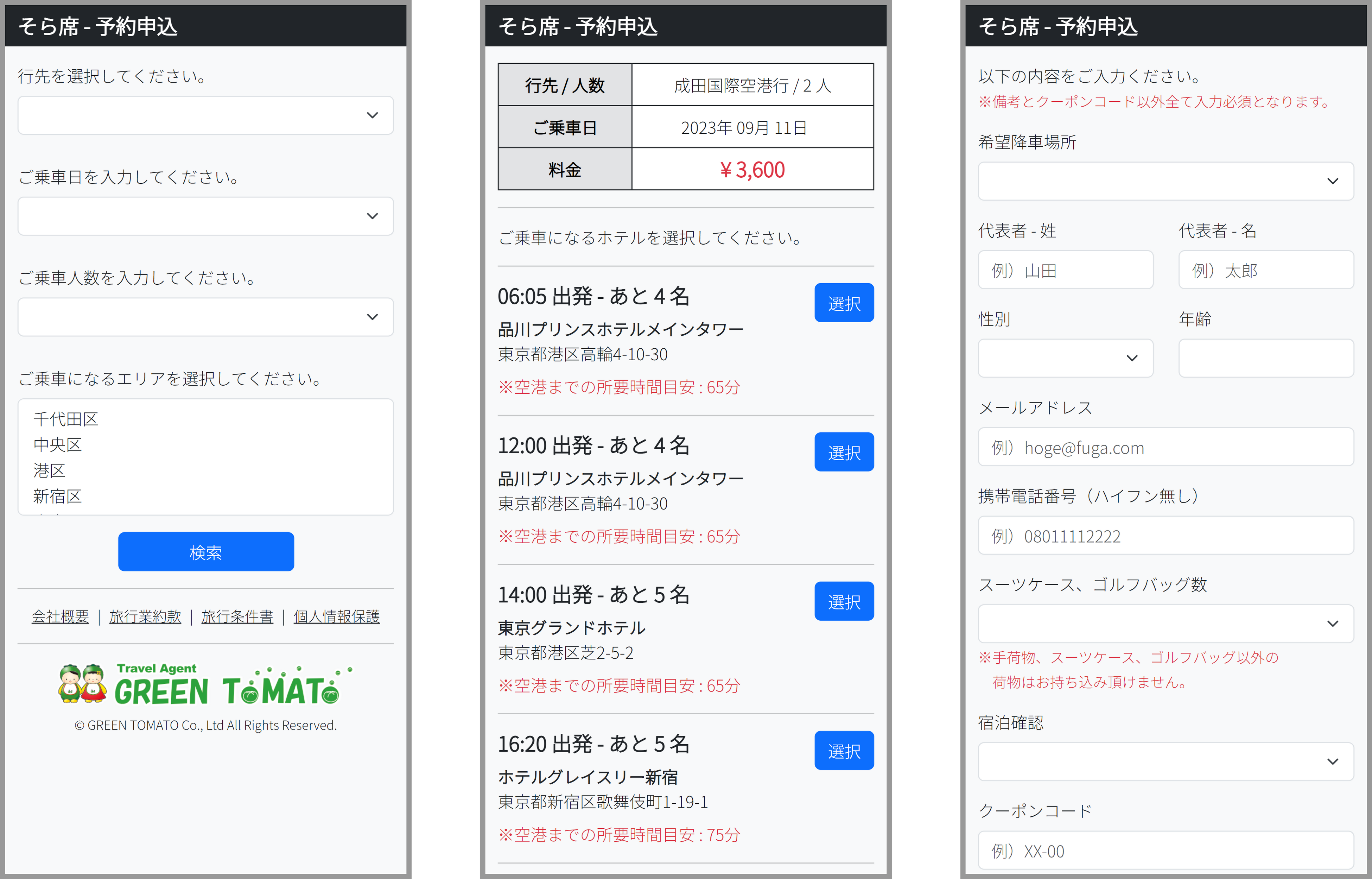 GREEN TOMATOが定める日時と場所の候補から選択していただく形のためご乗車日時と場所が限定されますが、エアポートシャトルよりお得な金額でご利用いただけます。