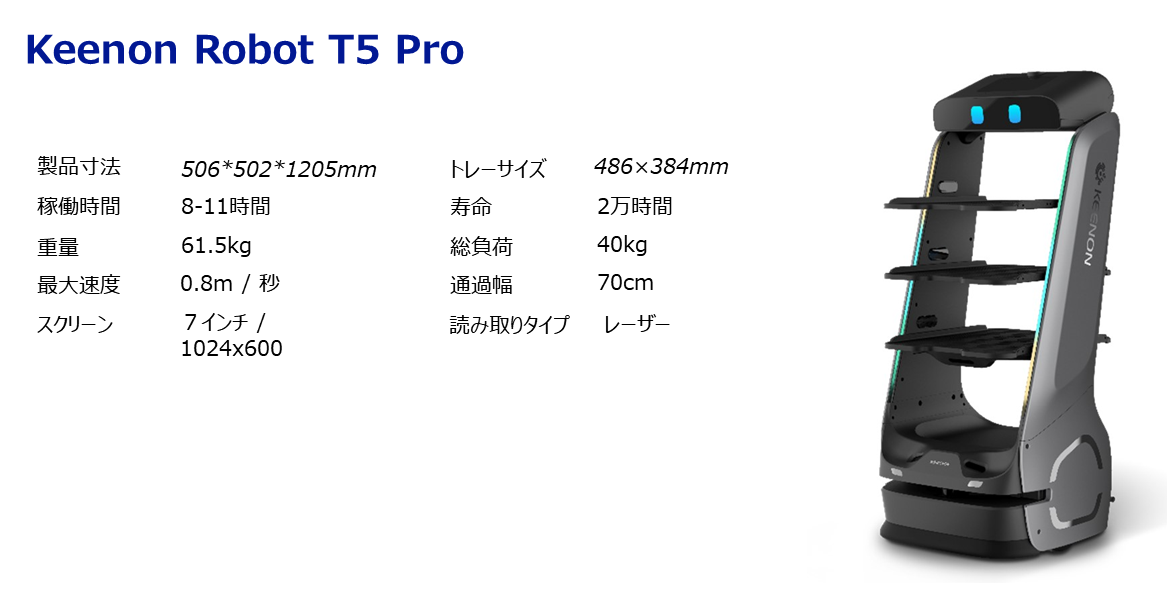 KEENON社が独自開発したより安定的で高級感溢れる「T5Pro」は、マルチリンク式のサスペンションによる衝撃吸収システムをもつ次世代型シャーシにより、優れた安定性を実現でき複雑な環境にも適応できます。新しいPID制御アルゴリズムが動作中の加速、減速、旋回に対し安定感を高め、効率的な配膳を実現します。3つのトレー検知センサーがトレーを取る・置く動作を瞬時に認識し、ライトや音声、テキスト表示で料理を受け取るタイミングを適切に通知できます。お客さまが受け取った後、引き続き次の配膳に向かいますが、これにより複数のテーブルに対する配膳サービスが可能となります。