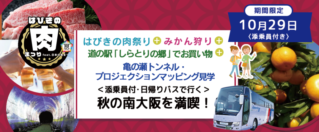 阪急梅田茶屋町口、梅田LOFT新御堂筋側前 9:00集合/9:10出発==JR大阪駅桜橋口 専門学校HAL大阪前9:30集合/9:40出発==京阪・大阪メトロ「天満橋」駅東側OMMビル 9:50集合/10:00出発==はびきの肉祭り会場(自由食)11:00着/12:00発==上の太子観光みかん園(みかん狩り食べ放題) 12:30着/13:30発==道の駅 しらとりの郷・羽曳野(買い物) 13:50着/14:30発==亀の瀬トンネル(プロジェクションマッピング見学) 15:30着/16:40発==天満橋駅周辺 18:00頃着==JR大阪駅桜橋口周辺 18:20頃着==阪急梅田茶屋町口、梅田LOFT新御堂筋側周辺 18:30頃着