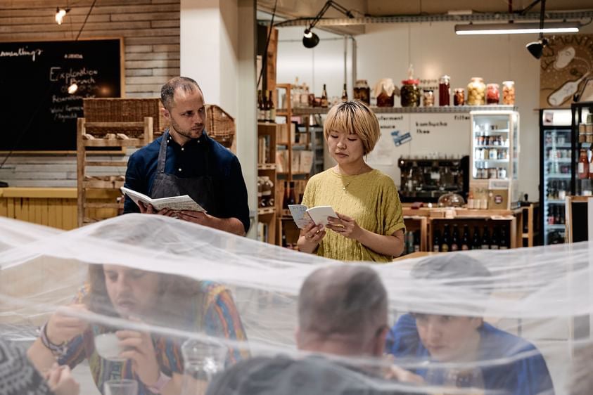 2021年に限定出版された、茉莉花と世界の発酵家たちによるビジュアルコラボレーションです。麹を題材とし読み手の感覚に訴えかけたその幻の麹本は、現在内8冊が移動図書として愛好家たちの間で貸し出され、八つの大陸でそれぞれの移動を続けています。その本が移動を続けるように、Alexanderと茉莉花は麹を取り巻く味噌、醤油、日本酒、甘酒、みりんなどの日本の麹発酵醸造方をベースに、茉莉花がヨーロッパで10年以上かけ探求してきたユニークな製法を生かした発酵醸造調味料と、長年のプラントベースキュイジンシェフとしてのAlexanderの巧みな技術と経験を掛け合わせ、新鮮な調理法とメニューを提案し続けています。