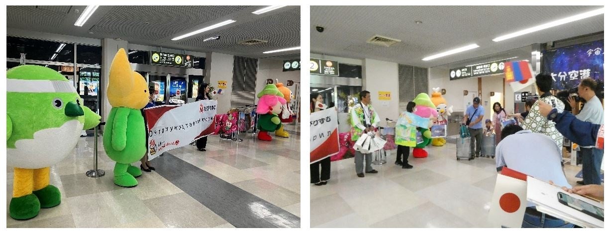 式典終了後、モンゴルからご到着された約100名のお客様を、大分県内の自治体関係者とマスコットキャラクター、大分航空ターミナル株式会社の皆様、株式会社たびりずむの社員でお迎えしました。