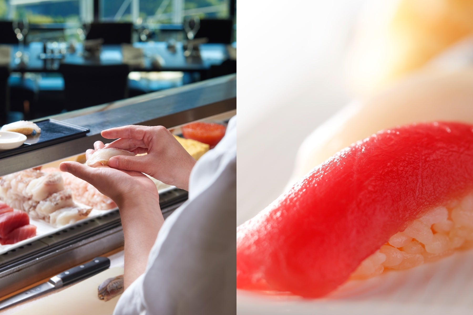 寿司職人がマグロなどの赤身のほか、季節の白身やいくらなどお好みのネタをその場で握ります。シャリに使用するお酢は、江戸時代より普及した日本発祥の酢「赤酢」。酒粕から長い熟成期間を経て発酵させたもので、ネタを引き立て旨みも倍増させます。