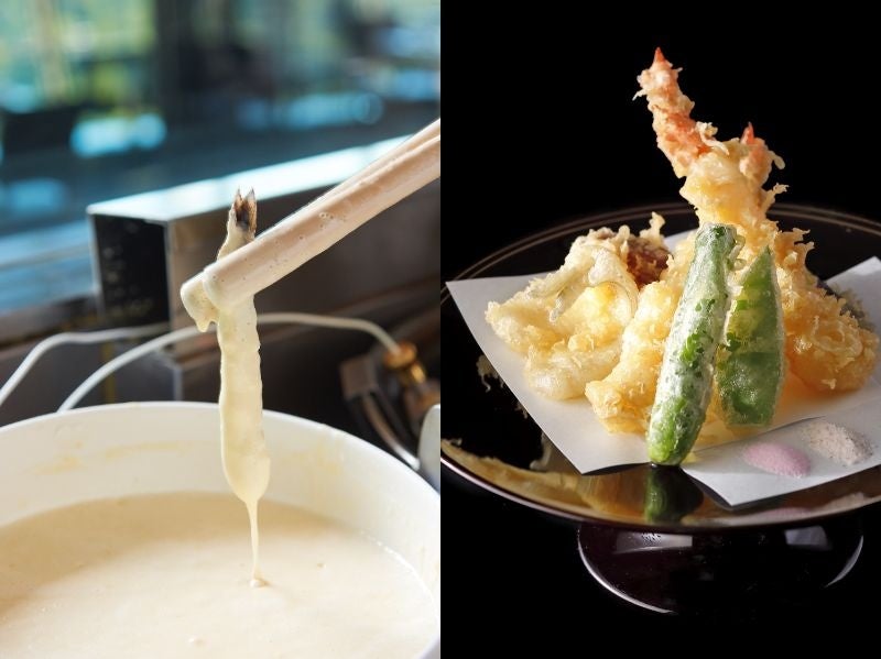 海老をはじめとする定番具材をはじめ、季節ごとに旬の食材がお目見え。日本料理の専任スタッフが丁寧に仕上げます。食感にこだわり揚げ油には「米油」、衣には「米粉」を使用しています。