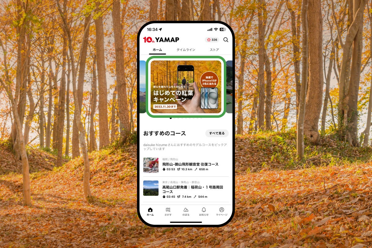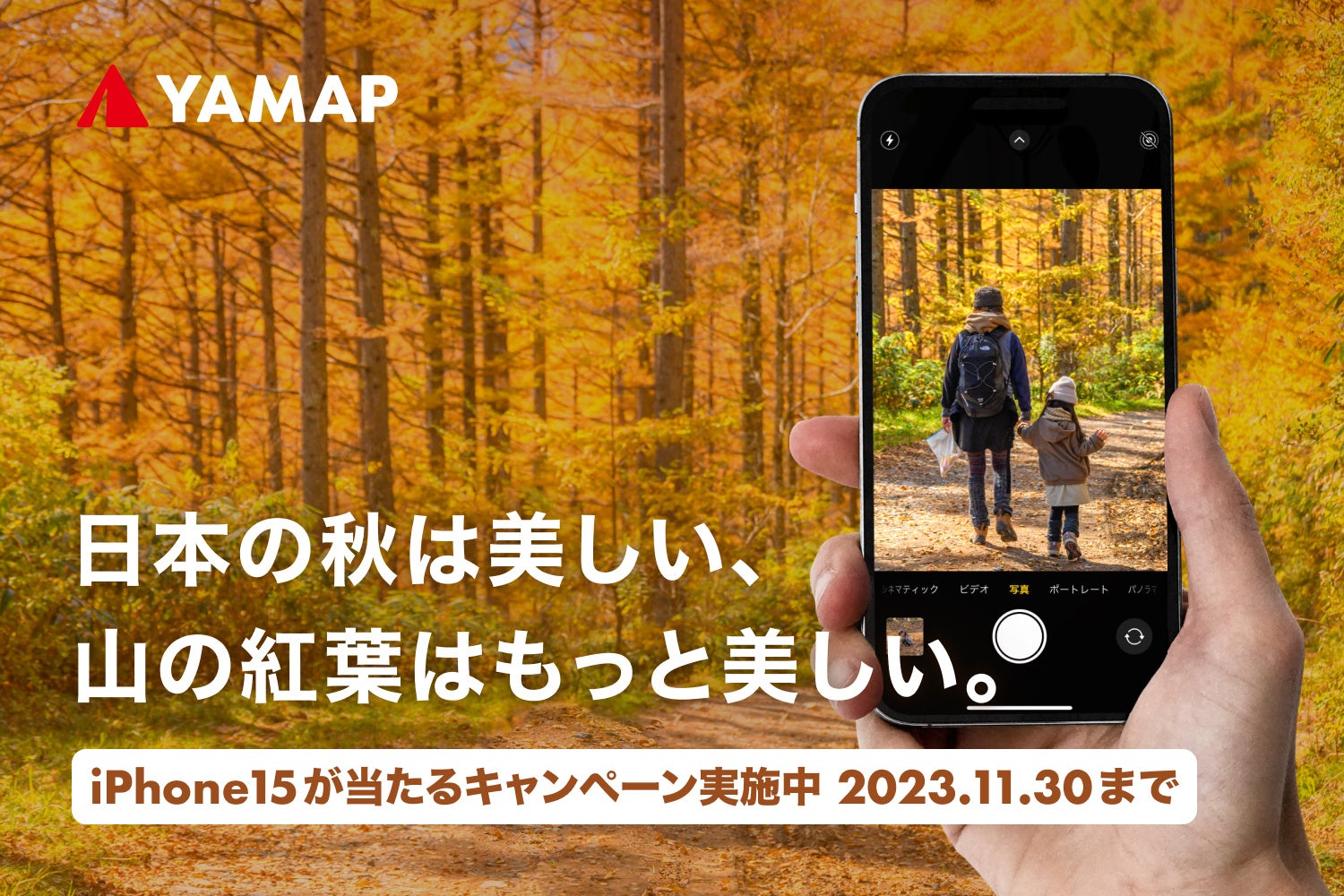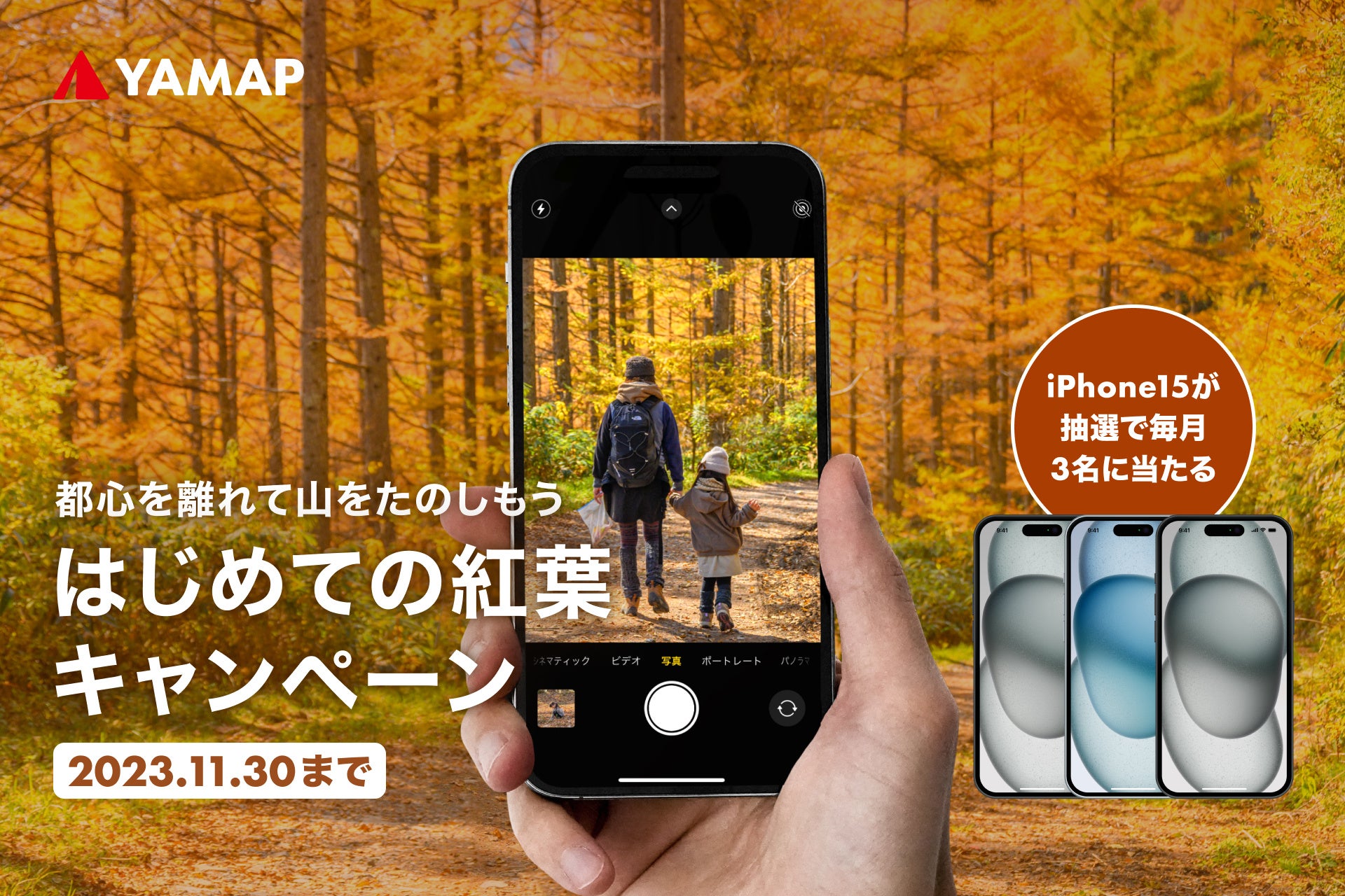 YAMAP はじめての紅葉キャンペーン 期間:11月30日(木)の投稿分までを対象 対象:YAMAPアプリを新規ダウンロードいただき、活動日記を投稿していただいたユーザーの方々 抽選方法:ユーザーのなかから10月、11月それぞれ3名の方を対象にプレゼントさせていただきます 商品:iPhone15(色の指定はできません) |