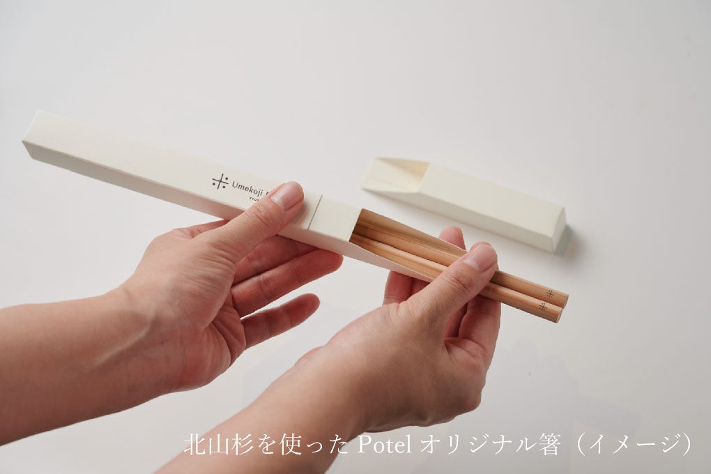 また、お皿だけでなくお箸にもこだわり、「お箸で旅する京都」のお題に沿って、軽やかで香りも良い北山杉のお箸でお料理を食べ進めていただきます。ひとつひとつ職人が手作りで作るため、手仕事のあたたかみを感じる逸品。こちらの箱に入ったPotelオリジナルのお箸はお食事のあと、ご自身でお持ち帰りいただきます。こちらはサスティナビリティの観点からMY箸としてご自宅に戻られてからも引き続きご利用ください。