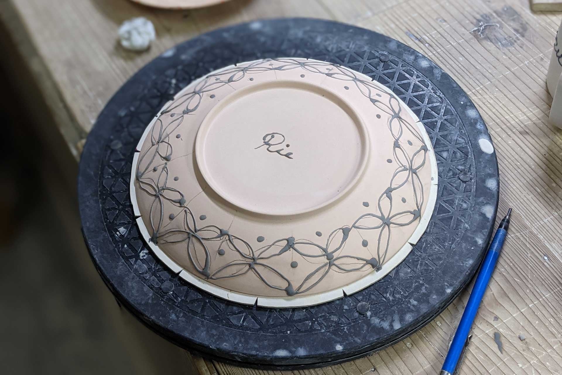いっちんとは、粘土を水でペースト状に溶いて袋に入れ、ケーキのデコレーションのように絞り出して描画する方法です。筆による絵付にはない立体感があり、独特の手ざわりを生みます。