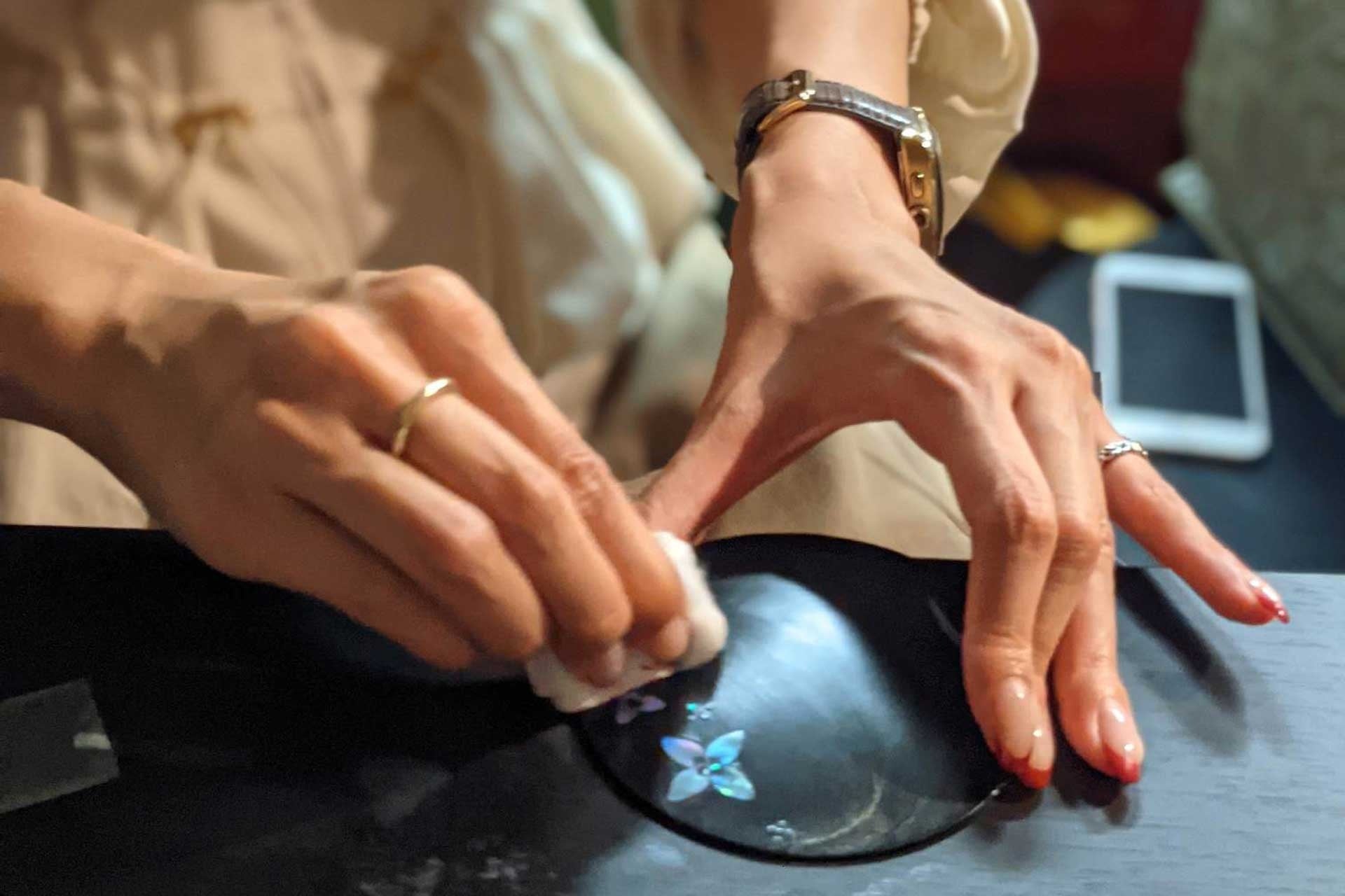 殻の内側のキラキラと 光を放つ部分を薄く切って、漆器の表面にはめこむ螺鈿。塗師職人の卓越した磨きの技術を体感しながら、美しく輝く螺鈿のオリジナル木箱を製作します。