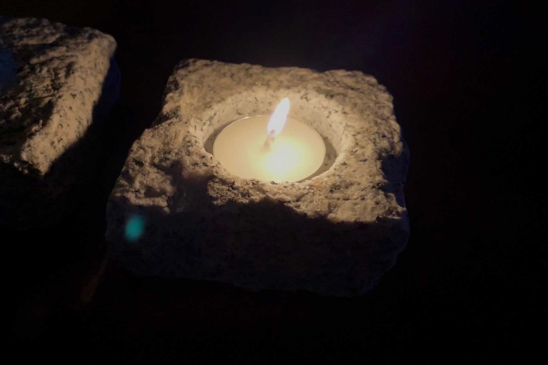 燈篭や墓石を制作する石材店で、石を削り、テーブルランタンを制作します。