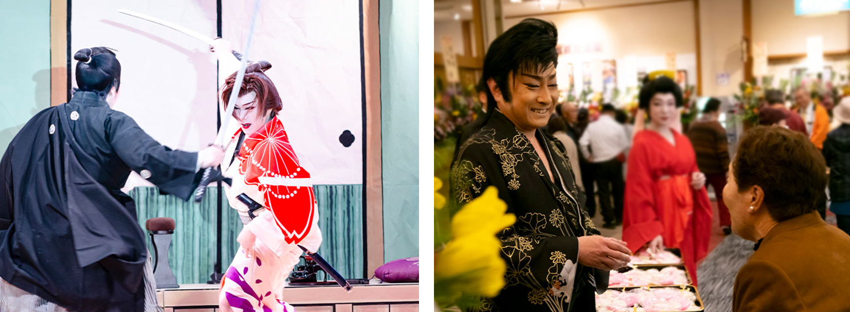 左:華麗な殺陣や華やかな衣装など、見どころ一杯いっぱいのお芝居は涙あり、笑いあり。