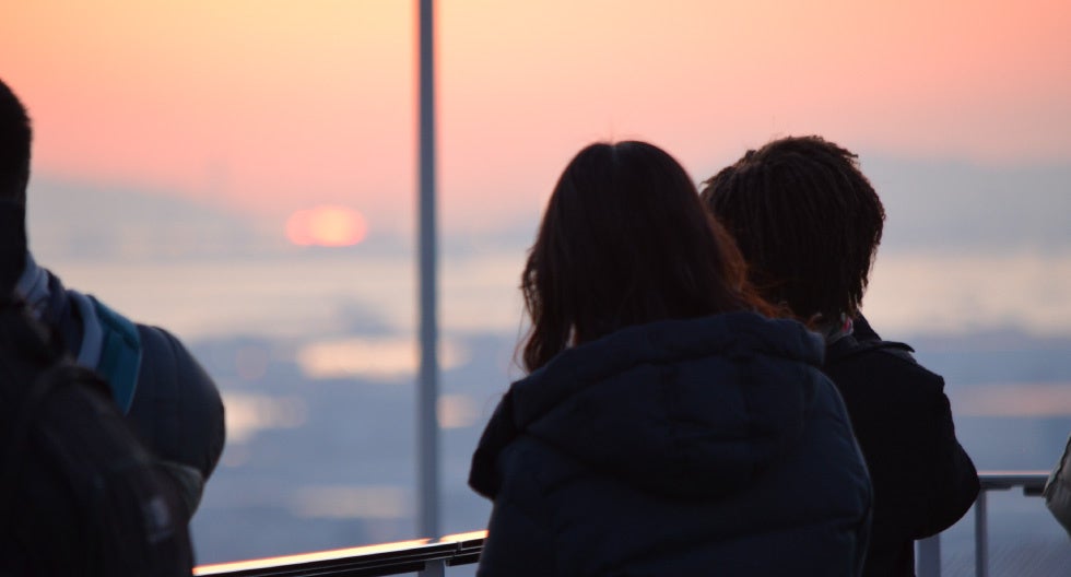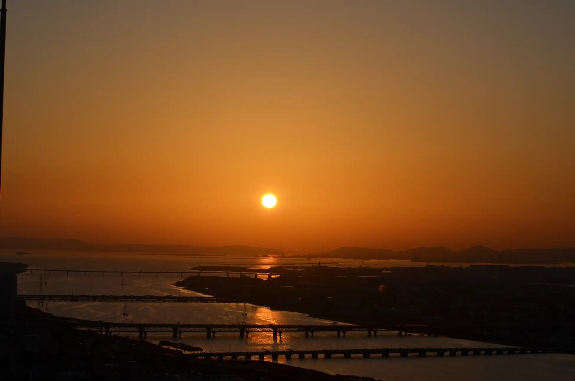 「日本の夕陽百選」にも選出されたことのある、梅田スカイビル・空中庭園展望台からの夕陽。中でも明石海峡大橋の真ん中に沈みゆく絶景を見ることができるのは2月と10月の数日間だけ。今年の見頃予測は10月20日~22日です。