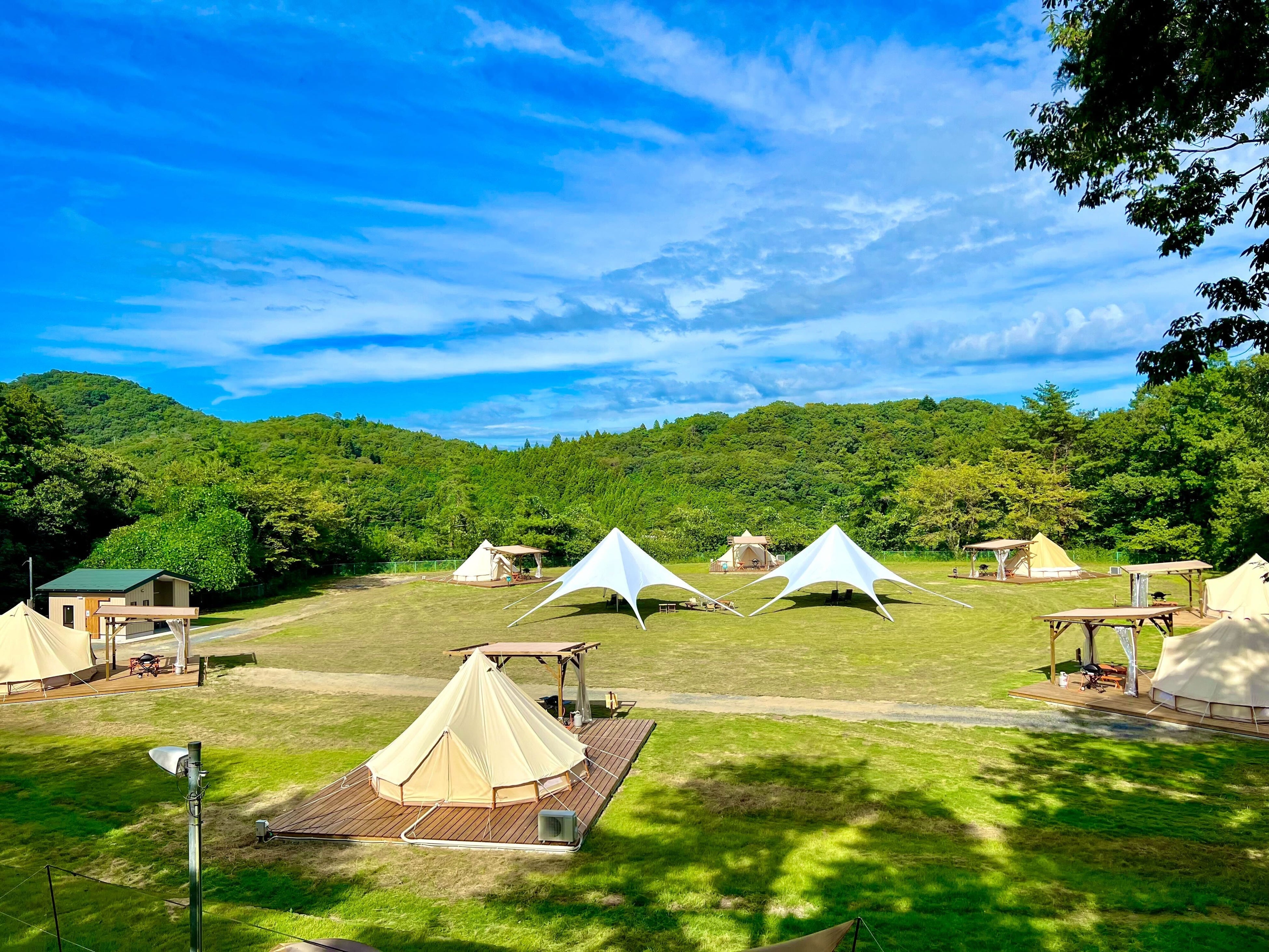 「ザランタンひたち大宮|パークアルカディア」は水戸市内から車で約40分、都内から約2時間の位置にある常陸大宮市に、2023年7月にオープンしたばかりのグランピング施設。