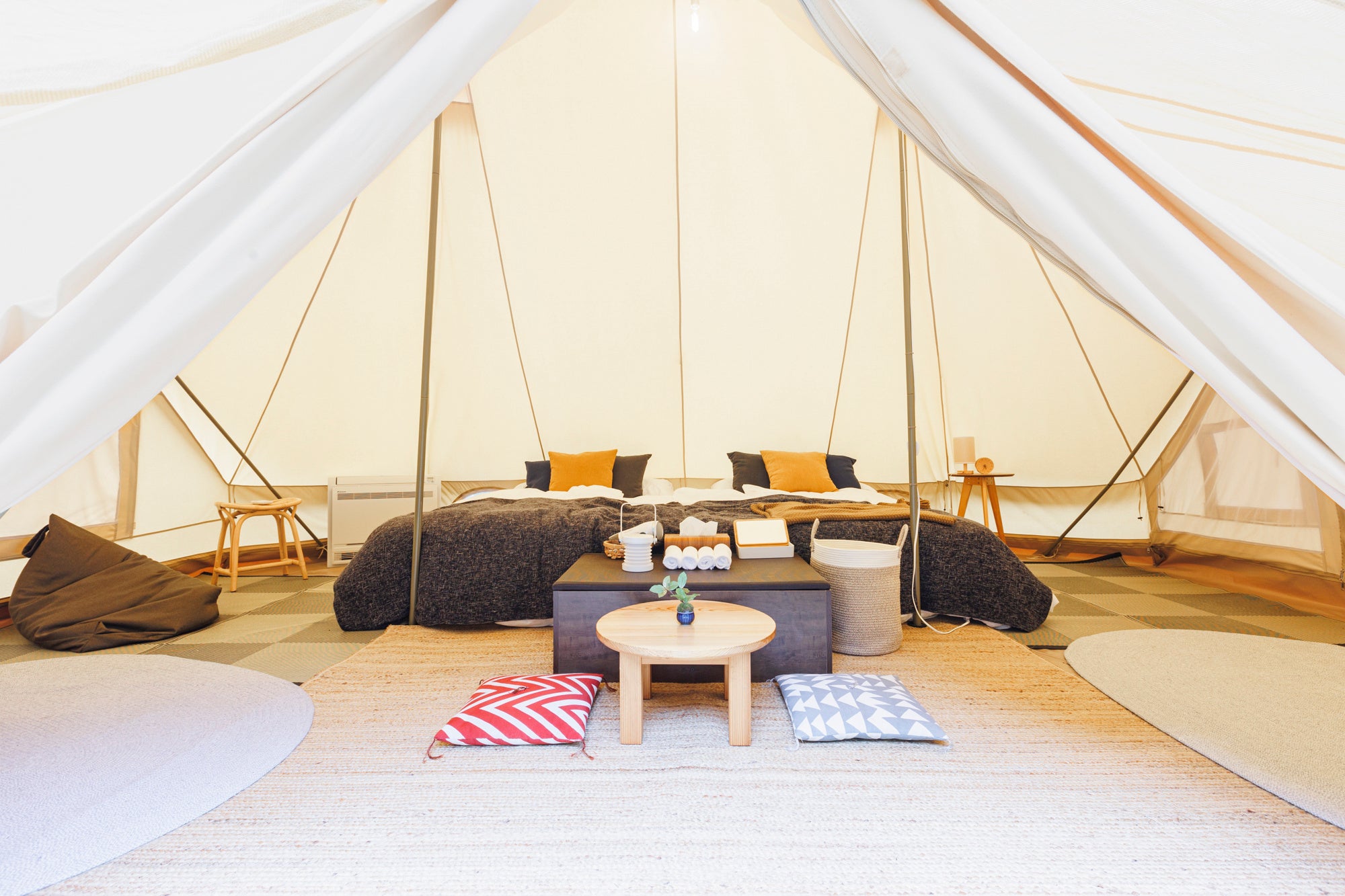 内装はアウトドアインフルエンサーのYURIEさん(@yuriexx67)が手がけており、里山の日本らしさを残したモダンでおしゃれな客室に統一。