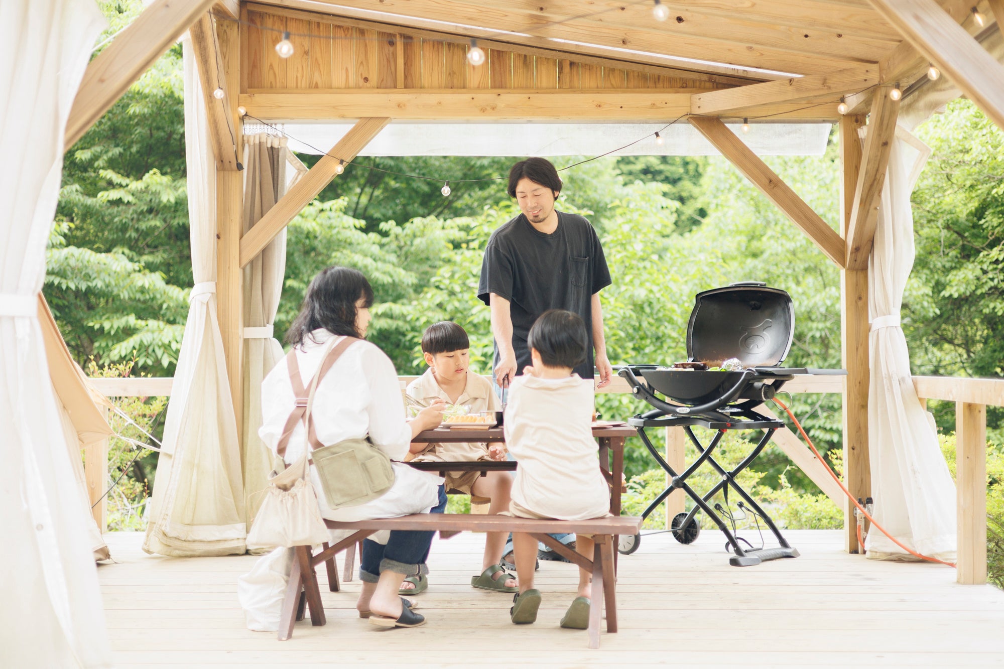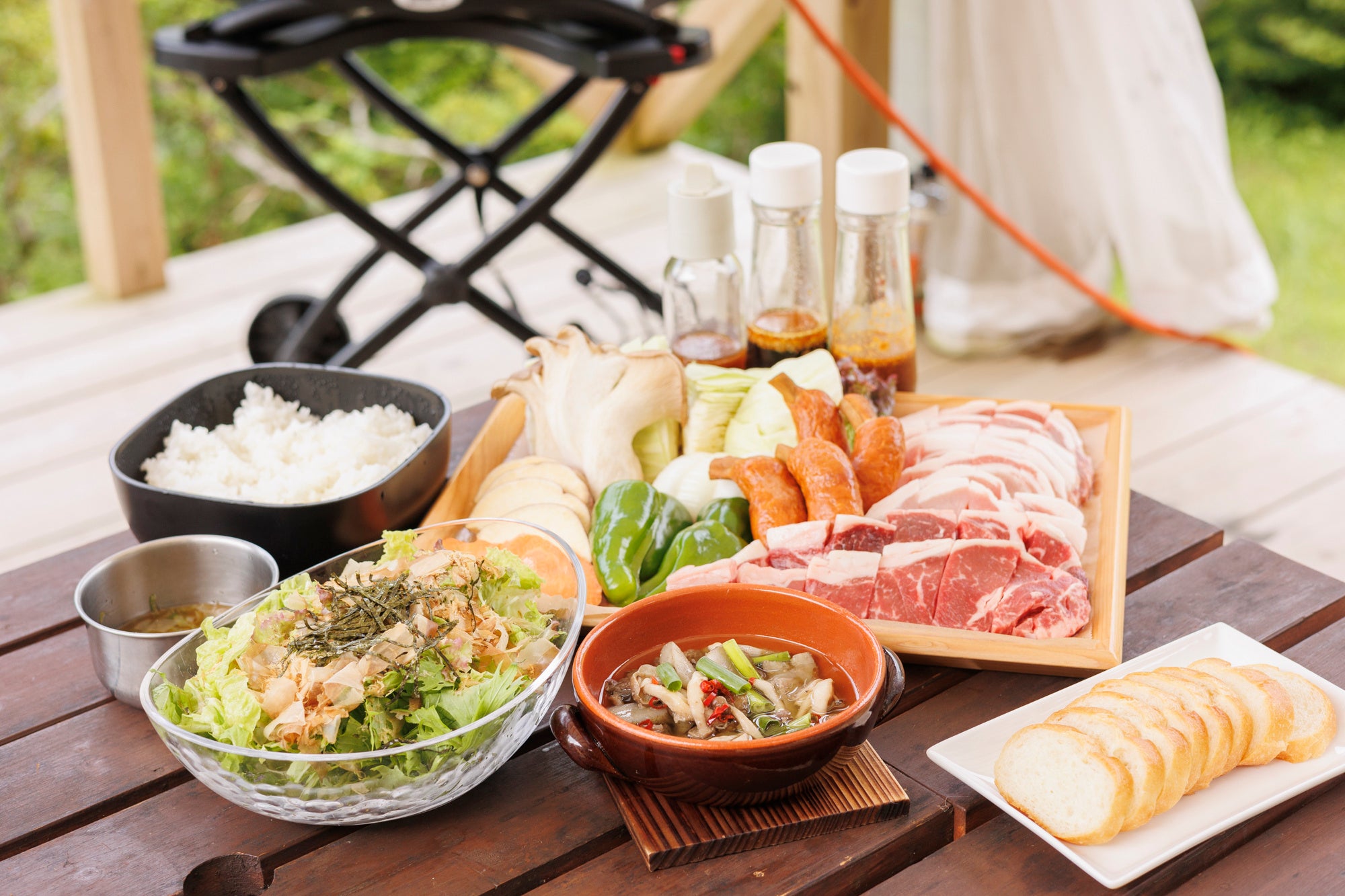 ご夕食のBBQは、テント前の屋根のついたウッドデッキや、バンガローのテラスにて、BBQ本場アメリカweber社のガスグリルでお楽しみいただけます。着火や準備、片付けなどは全てスタッフで行いますので、はじめての方でも心配不要。調味料・お皿もすべて用意しているため、事前に食材や食器を持ってくる必要はありません。