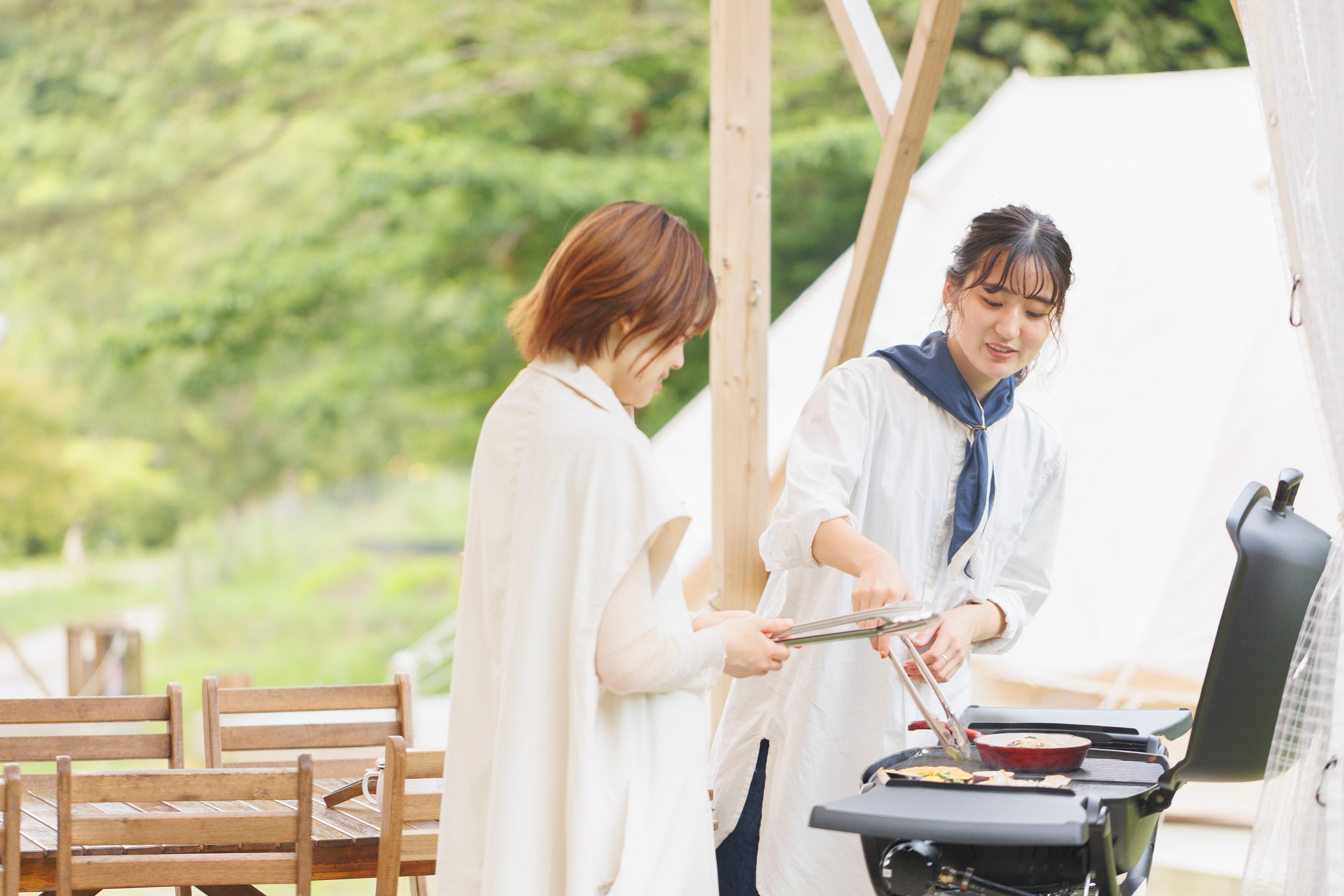 BBQはテント前の屋根のついたウッドデッキにて、BBQ本場アメリカweber社のガスグリルで夕食をお楽しみいただけます。