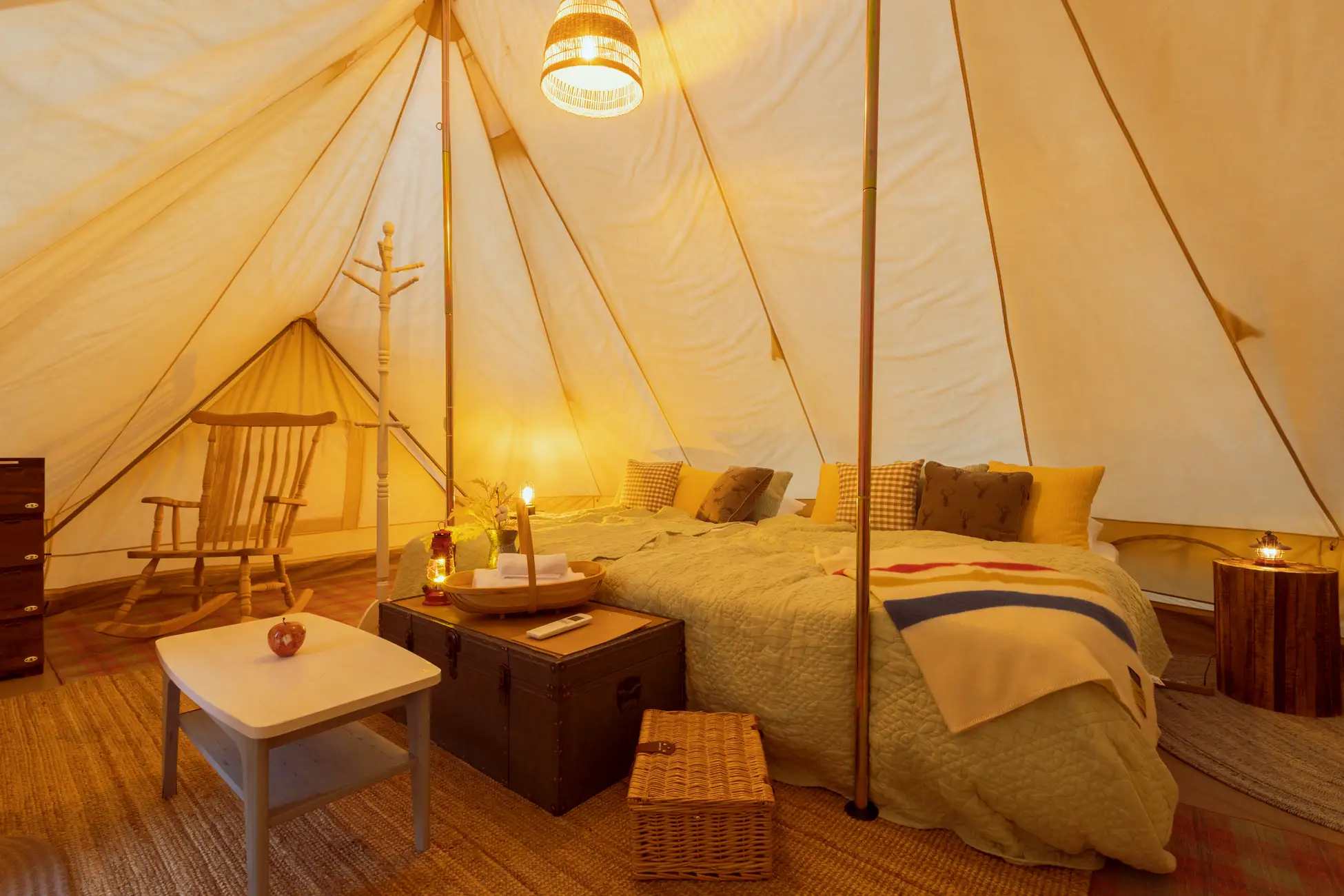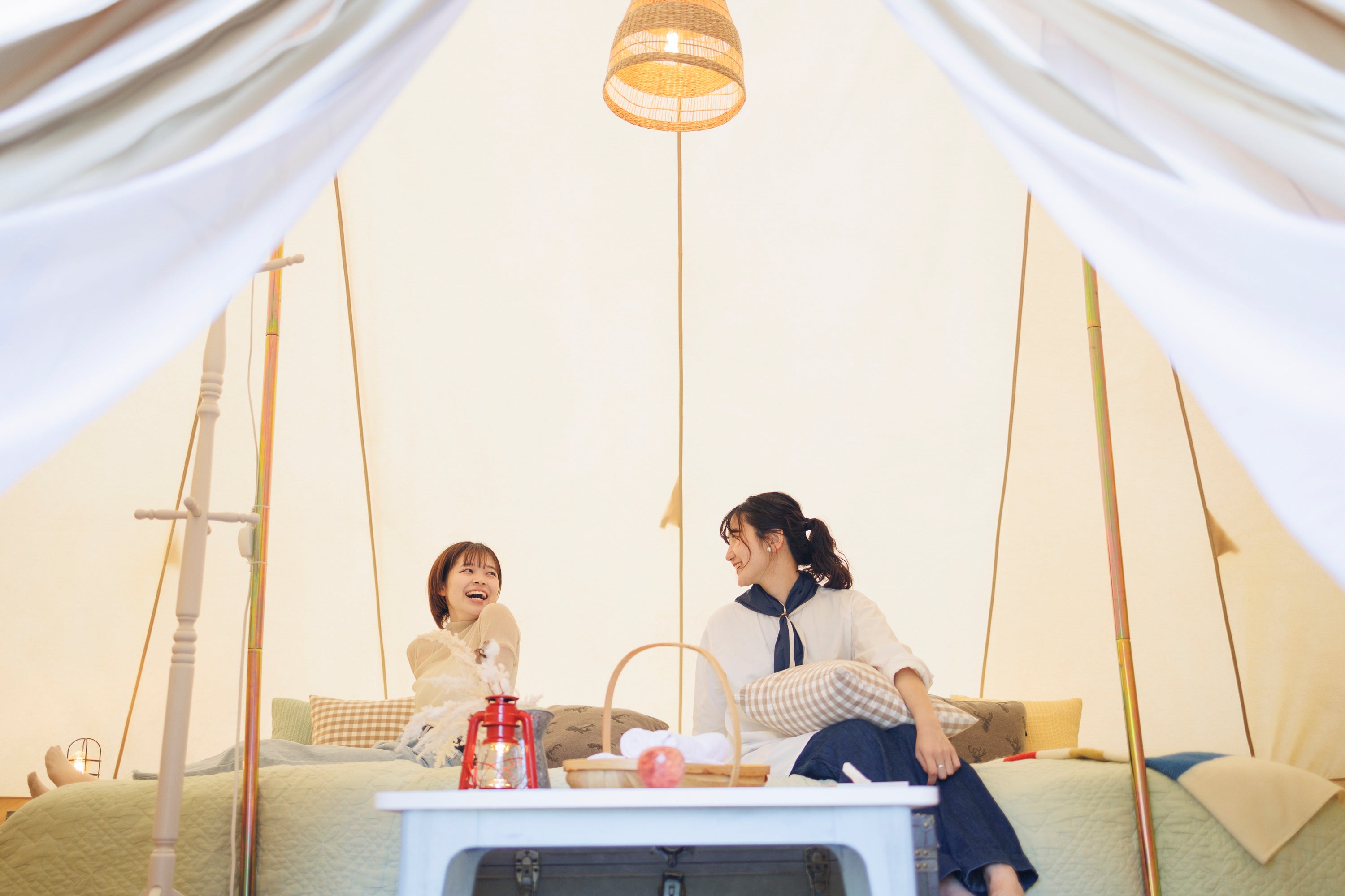 テント内装はアウトドアインフルエンサーのYURIEさん(@yuriexx67)がコーディネートした、異国を思わせる風景や空気感を持つ三瀬村のイメージをもとにヨーロッパ風のシャビーシックな内装で統一。老若男女問わず好評をいただいております。
