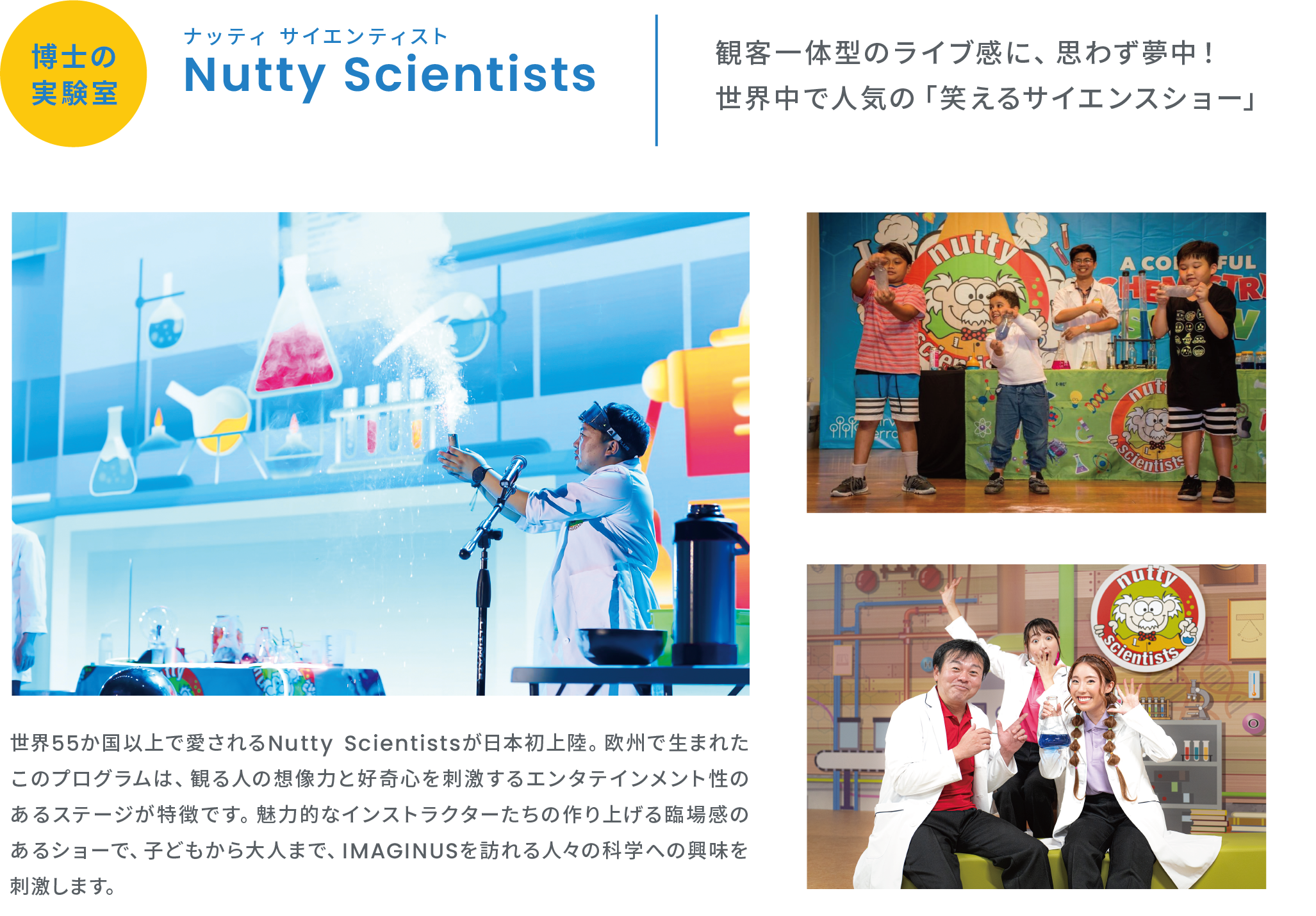 (ナッティ サイエンティスト)が日本初上陸!約30分間のサイエンスショーでは、ライブ感あふれる様々な科学実験を行います。魅力的なインストラクターのもと、観客一体となって盛り上がること間違いなし。