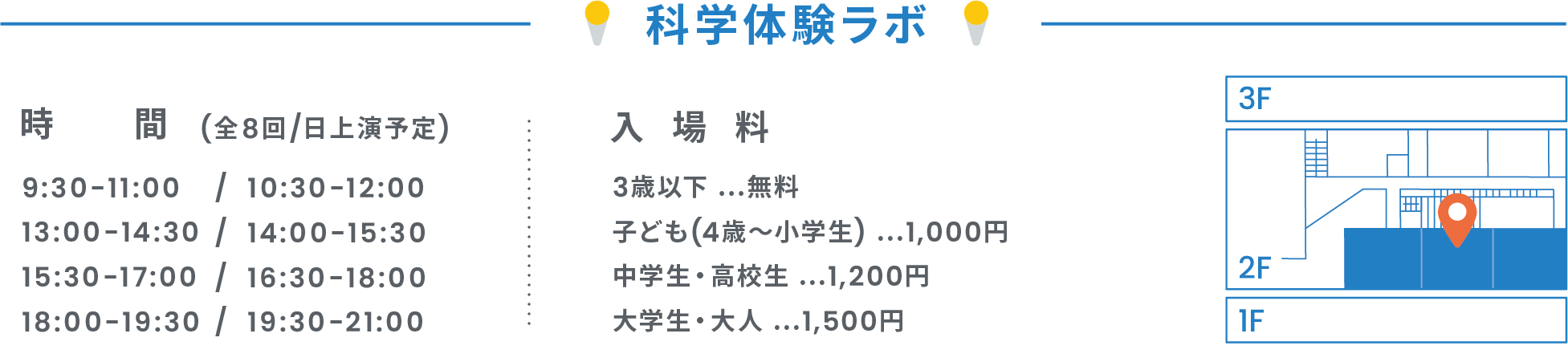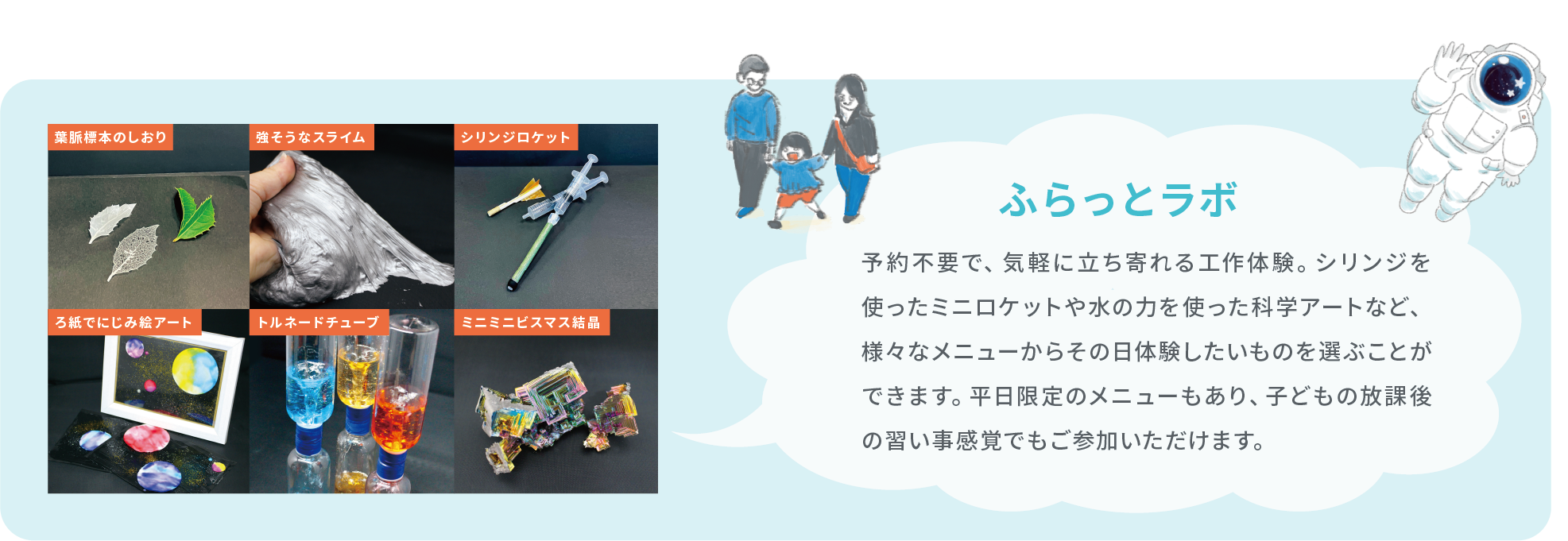 笑いと驚きが止まらないサイエンスショーや、遊びながら学べる科学実験などを通して、科学の楽しさを”どっぷり”体験できるメインエリアです。